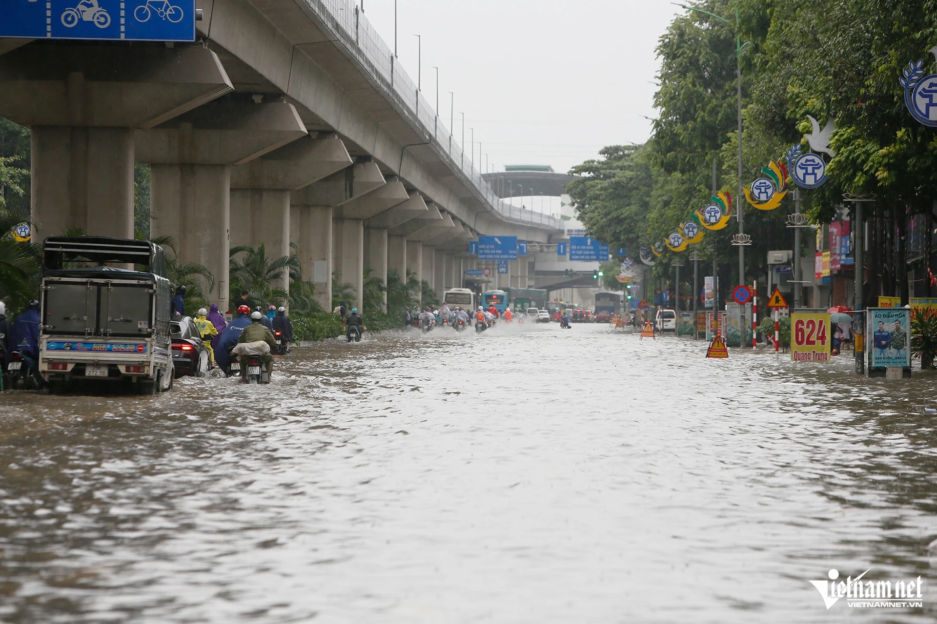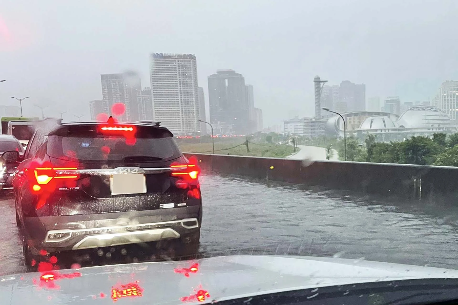Cơn mưa lớn sáng 7/10 khiến nhiều tuyến đường ở Hà Nội ngập sâu , thậm chí trên tuyến vành đai 3 trên cao có đoạn nước ngập lút bánh ô tô.