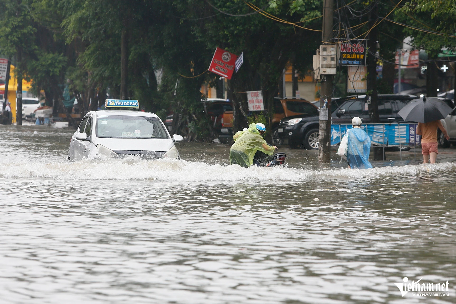 Còn đường Quang Trung (đoạn gần nút giao Quang Trung – Lê Trọng Tấn, phường Kiến Hưng) nước ngập sâu gần 0,5m, người đi xe máy không thể di chuyển qua đoạn ngập.