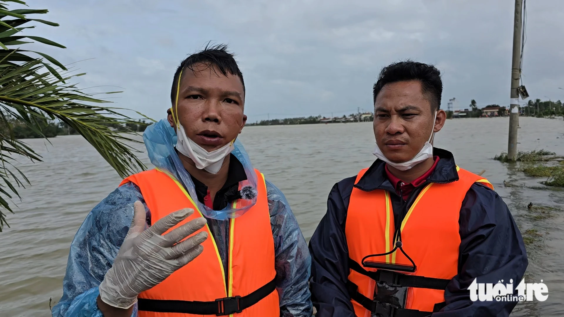 Anh Nguyễn Đình Sướng (ngụ TP Đà Nẵng, bên trái) và anh Cao Đức Duy (ngụ TP.HCM) kể lại giây phút nhói lòng khi hỗ trợ đưa thi thể hai cụ ra khỏi vùng ngập nước – Ảnh: MINH HÒA