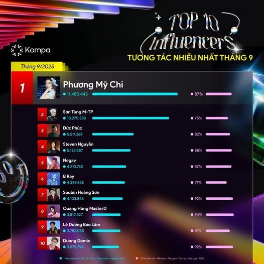 Mới đây, bảng xếp hạng Top 10 Influencers có tương tác nhiều nhất tháng 9/2025 do Kompa công bố đã thu hút sự quan tâm của công chúng. Theo số liệu đưa ra, Phương Mỹ Chi dẫn đầu đoàn đua, sở hữu lượt tương tác cao nhất với hơn 11 triệu điểm. Đặc biệt hơn, cô nàng gen Z vượt mặt cả 2 tên tuổi lớn là Sơn Tùng và Đức Phúc để nắm giữ ngôi vương. Phương Mỹ Chi còn gây sốc khi là gương mặt nữ duy nhất nằm trong BXH, chứng minh thế trận Vpop đang chứng kiến sự trỗi dậy của nghệ sĩ nữ.