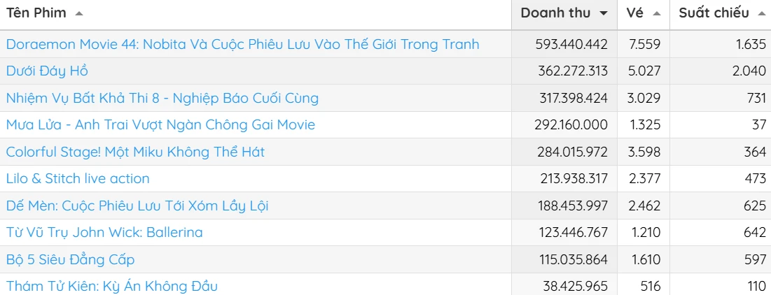 Doraemon Movie 44 đã đánh bại nhiều đối thủ nặng ký để giữ vững vị trí top 1 phòng vé trong nhiều tuần. Đây cũng là bộ phim ngoại đầu tiên đạt doanh thu hơn trăm tỷ trong năm 2025.