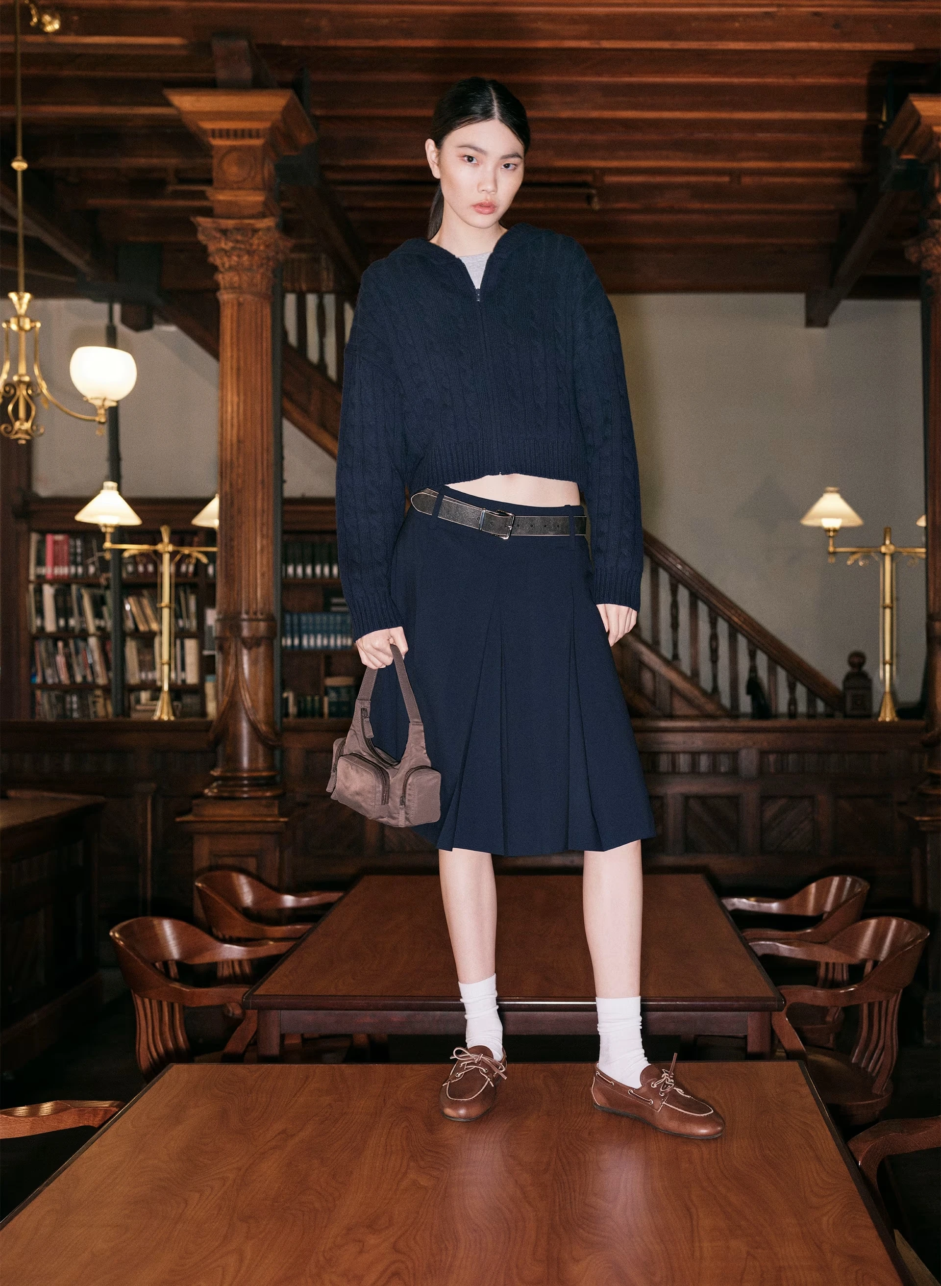 Chân váy ngắn xếp ly cùng tông xanh navy không chỉ giữ nguyên tinh thần preppy mà còn khéo léo khoe đôi chân thon thả, cân bằng sự nghiêm túc của chiếc áo len.