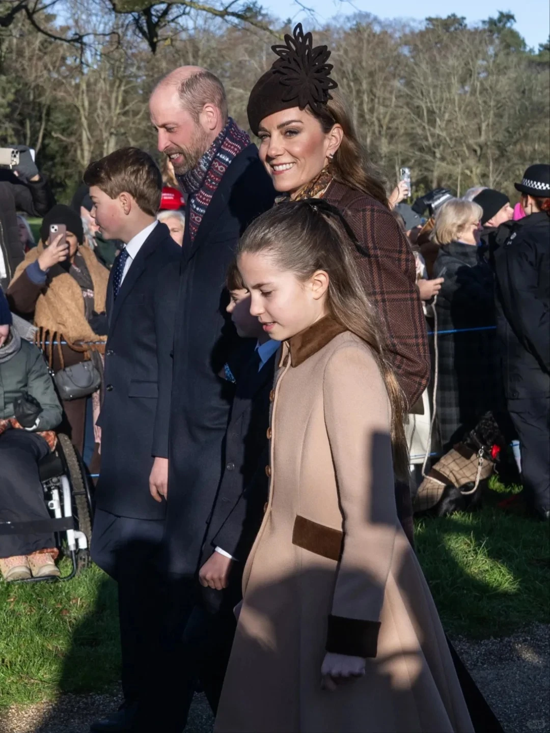 Sáng ngày 25/12, không khí tại nhà thờ St Mary Magdalene (Sandringham) bỗng trở nên ấm áp hơn hẳn khi gia đình Thân vương William và Vương phi Kate Middleton xuất hiện để tham gia lễ cầu nguyện Giáng sinh truyền thống. Giữa rừng ống kính phóng viên và sự chào đón nồng nhiệt của người dân, tâm điểm chú ý lại va vào cô bé Charlotte. Người ta vẫn thường ví von Charlotte là “bản sao ” của Nữ hoàng quá cố hay mang nét đẹp của bà nội Diana, nhưng hôm nay, cô bé đơn giản là một nàng công chúa nhỏ đang dần trưởng thành với phong cách cá nhân đậm nét.
