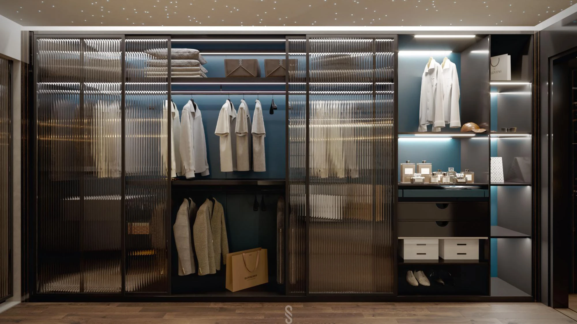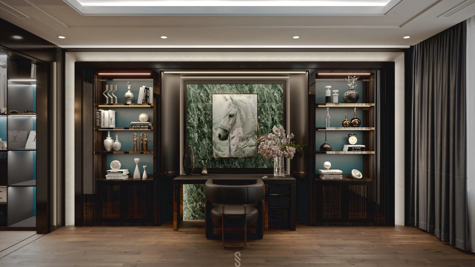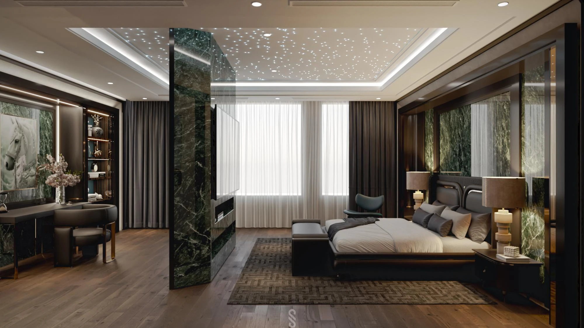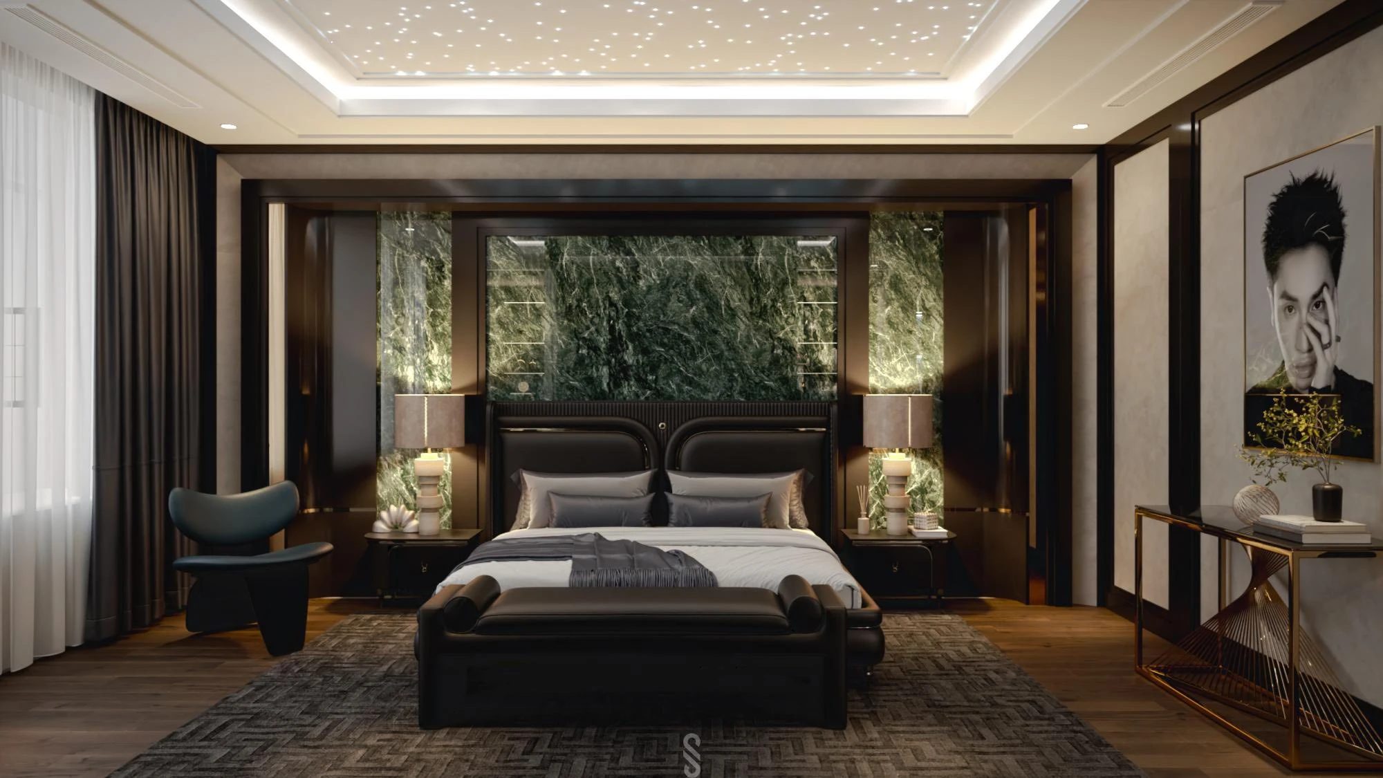Theo đó căn phòng mang phong cách hiện đại và sang trọng với tông đen – xám chủ đạo, điểm nhấn là mảng tường ốp đá xanh vân mây. Hệ đèn trần ánh sao cùng ánh sáng hắt vàng tạo cảm giác ấm áp, thư giãn cùng với nội thất tinh gọn, đối xứng y hệt khách sạn 5 sao.