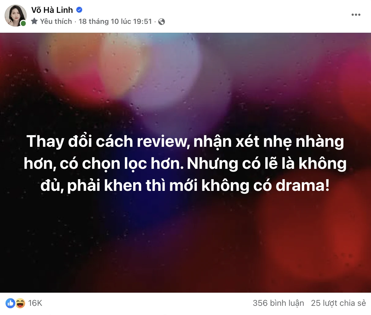 Một bài đăng nhận xét của Võ Hà Linh vào tháng 10/2025