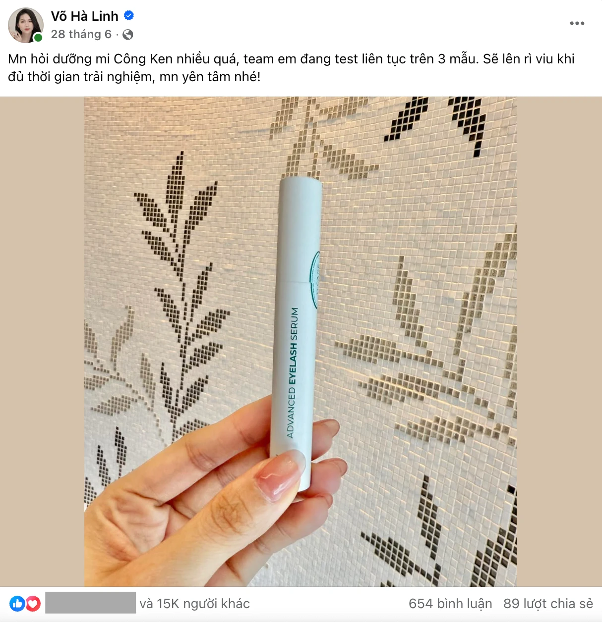 Võ Hà Linh nhắc đến sản phẩm dưỡng mi và nhắc tên Công Ken lần đầu tiên vào cuối tháng 6/2025. Khi đó cô cho biết vì mọi người hỏi quá nhiều nên đang test và sẽ có cập nhật sau 1 thời gian sử dụng.