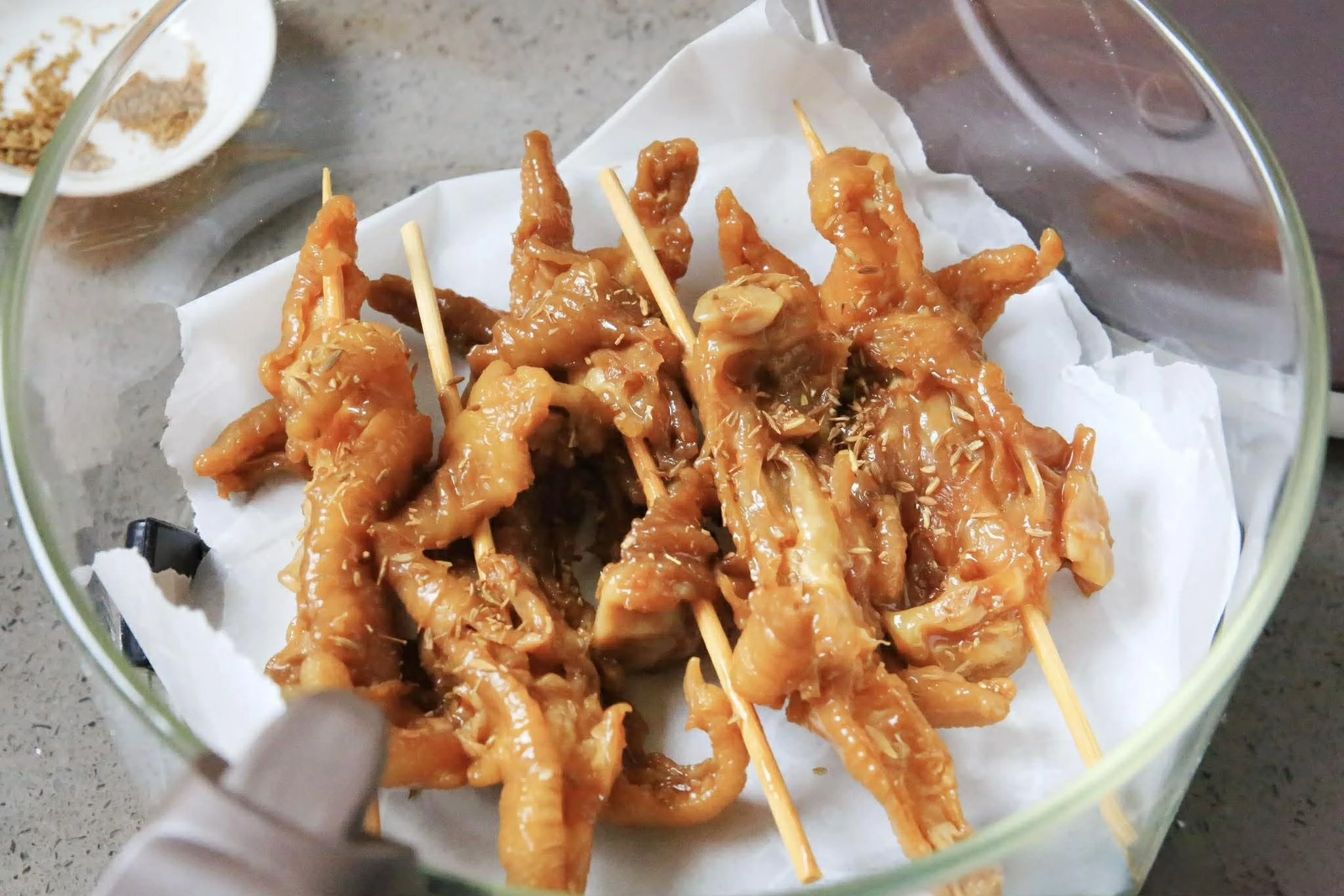 Bước 3: Sau khi chân gà đã ngấm gia vị, bạn xiên từng chiếc vào que tre. Tiếp theo cho chân gà rút xương vào nồi chiên không dầu, rắc một nửa lượng bột thì là lên trên và nướng trong 10 phút. Sau đó lật mặt kia lên, rắc phần bột thì là còn lại và tiếp tục nướng trong 5 phút.