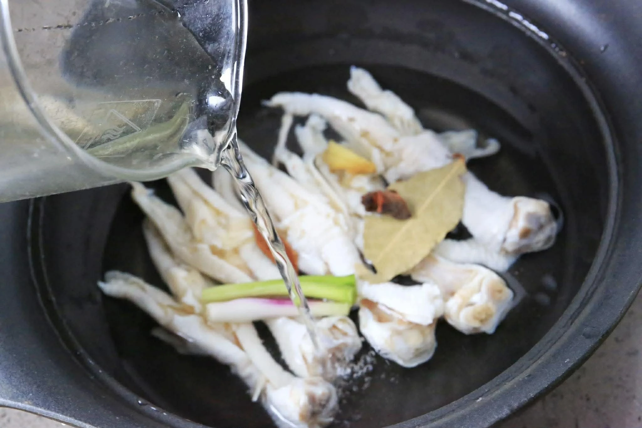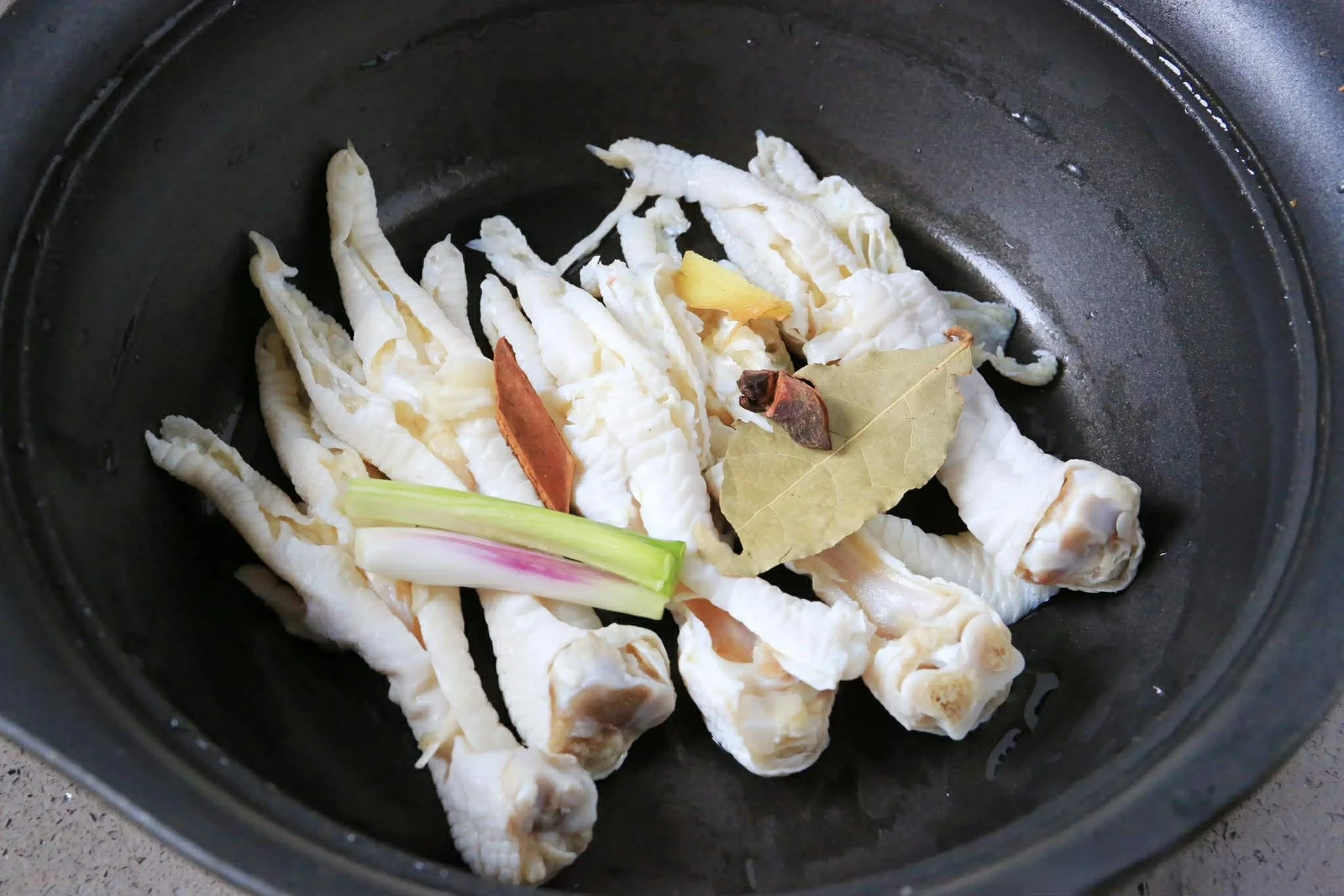Bước 1: Chân gà rút xương bạn có thể mua loại đã được chế biến sẵn tại các siêu thị hoặc tự mua chân gà về, rửa thật sạch, sau đó cắt bỏ móng, dùng dao và kéo cắt/rạch rạch các đường trên chân gà để rút bỏ hết xương. Sau đó cho chân gà rút xương vào nồi, thêm gừng cắt lát, hoa hồi, quế và lá nguyệt quế, rượu nấu ăn và lượng nước ngập chân gà rồi nấu trong khoảng 5 phút.