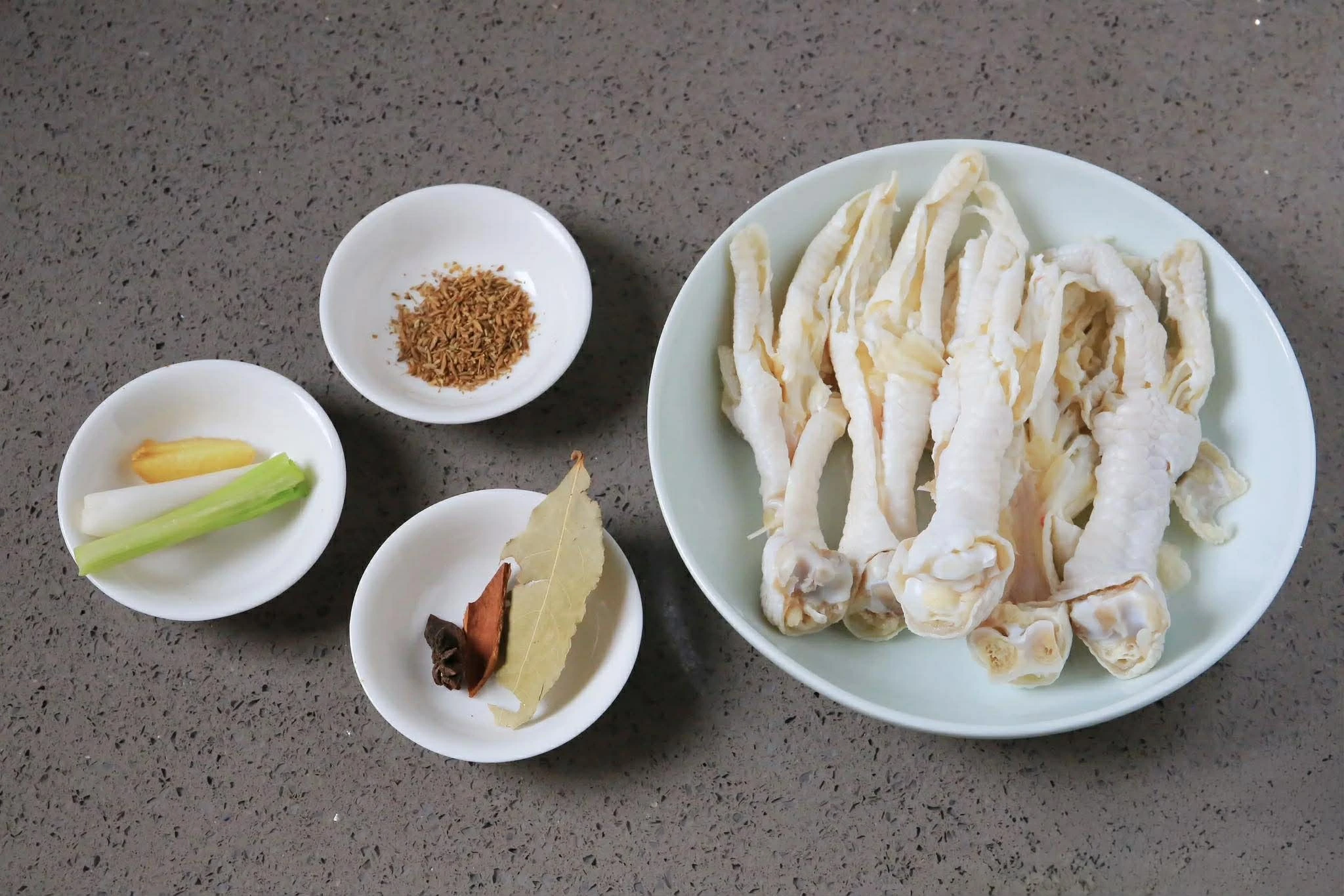 Nguyên liệu chính: 5 chân gà rút xương (tăng lượng tùy thuộc khẩu phần ăn), một ít hành lá thái nhỏ, 1 muỗng canh bột thì là, 1 cái hoa hồi nhỏ, 1 miếng quế nhỏ, 1 lá nguyệt quế, 2 lát gừng, 2 khúc hành lá.