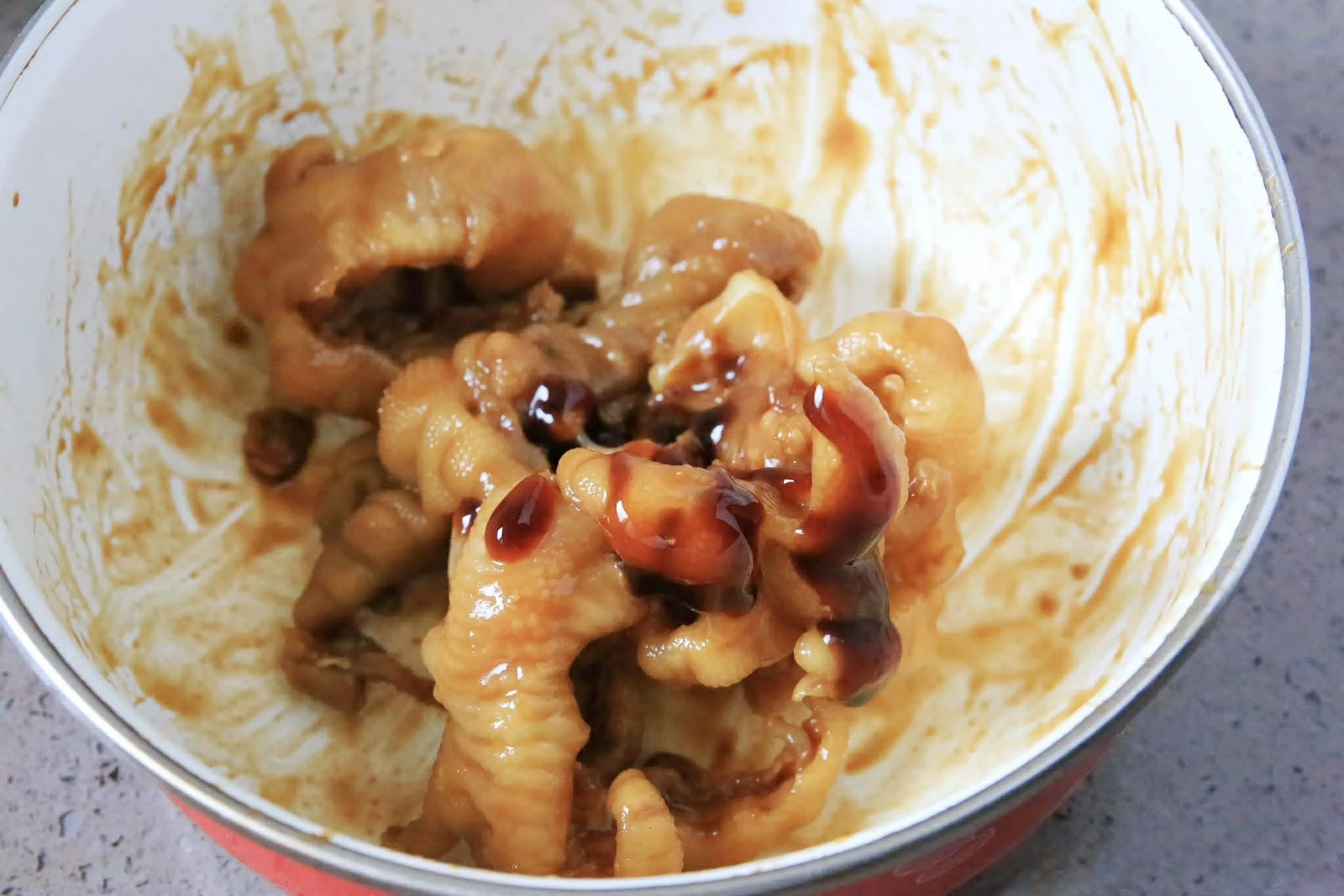 Việc chuẩn bị chân gà rút xương là một công đoạn tỉ mỉ. Loại bỏ xương trong khi vẫn giữ lại da và gân sẽ tạo nên kết cấu dai, mềm, giúp bạn có trải nghiệm tuyệt thực sự thú vị khi thưởng thức. Sự kết hợp giữa sốt tương đậu ngọt và dầu hào là cốt lõi hương vị của món ăn này. Vị mặn ngọt đậm đà của sốt tương đậu ngọt bổ sung hoàn hảo cho vị umami của dầu hào. Ướp trong 20 phút giúp chân gà ngấm đều hương vị của nước sốt.