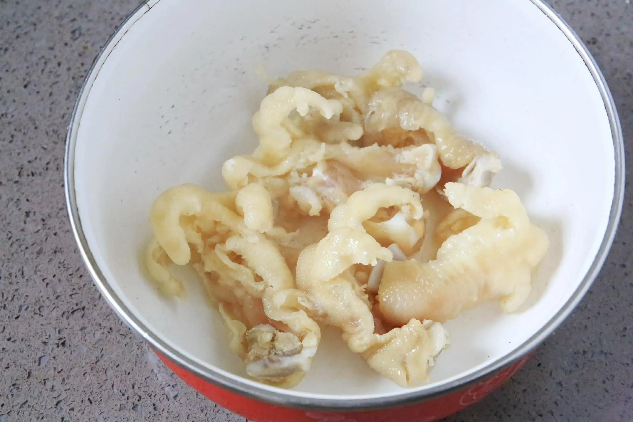 Luộc với lửa lớn, đến khi sôi thì nhỏ lửa lại luộc chín trong khoảng 15 phút. Không luộc quá kỹ sẽ khiến chân gà mềm và rã ra. Dùng tăm đâm vào chân gà, nếu xuyên qua dễ dàng tức là đã chín.