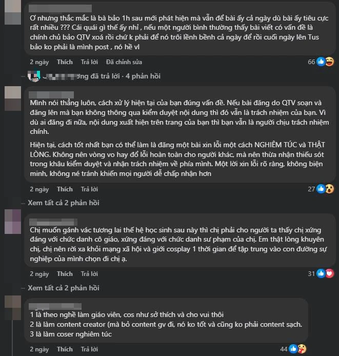 Nhiều ý kiến phê bình gay gắt rằng bài xin lỗi của Q.H dù có vẻ chân thành nhưng thực chất vẫn là một cách đổ lỗi cho cấp dưới để bảo vệ hình ảnh cá nhân. Việc một người sắp đứng trên bục giảng lại không kiểm soát được hành động cá nhân và tài khoản mạng xã hội của mình bị coi là sự thiếu trách nhiệm trầm trọng.