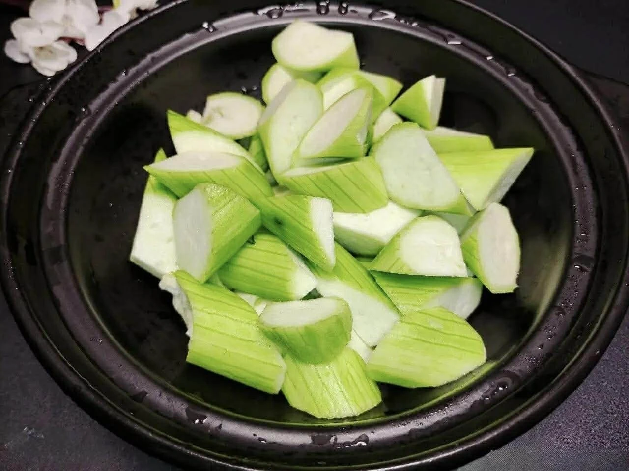 Bước 1: Trước tiên, hãy gọt bỏ vỏ mướp sau đó rửa sạch. Cắt mướp thành miếng nhỏ và cho vào bát. Vì mướp dễ bị oxy hóa và đổi màu sau khi cắt, nên bạn nên cho thêm một ít nước lạnh vào bát, rưới một chút giấm trắng và khuấy đều để ngăn ngừa hiện tượng đổi màu hiệu quả.