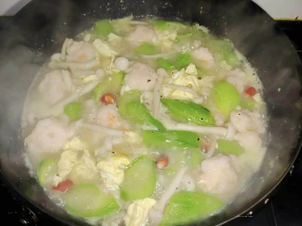 Đây là một món ăn nấu nhanh mà ngon tuyệt! Nước dùng đậm đà, rau củ mềm, mướp xanh tươi và mướt mịn, chả tôm có màu trắng hồng đẹp mắt. Khi thưởng thức món ăn này, bạn sẽ cảm nhận được vị ngọt của mướp, tiếp theo là độ mềm mịn của nấm ngọc châm trắng, và cuối cùng là độ giòn dai ngon của chả tan chảy trong miệng. Món ăn này ngon và dễ làm. Nếu bạn muốn đổi vị cho gia đình thì nhất định phải thử công thức này nhé. Chắc chắn cả nhà sẽ tấm tắc khen.