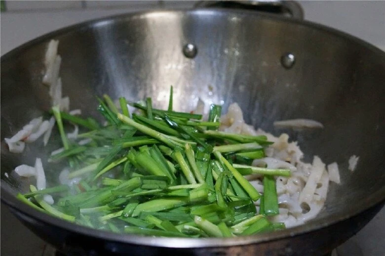 Cho hẹ đã cắt khúc vào chảo, đảo đều trên lửa lớn đến khi hẹ vừa chín tới (không nên xào quá lâu để giữ màu xanh và độ giòn).
