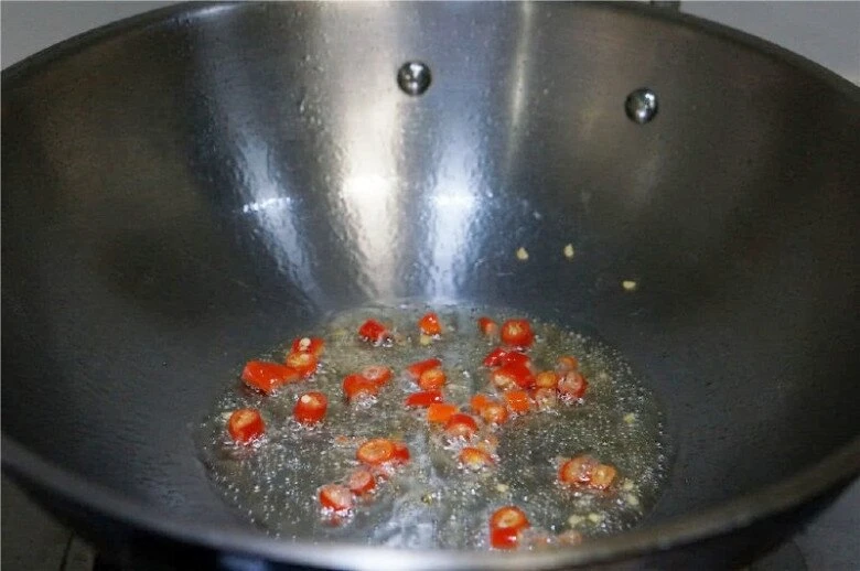 Cho ớt vào xào trên lửa nhỏ đến khi dậy mùi thơm.