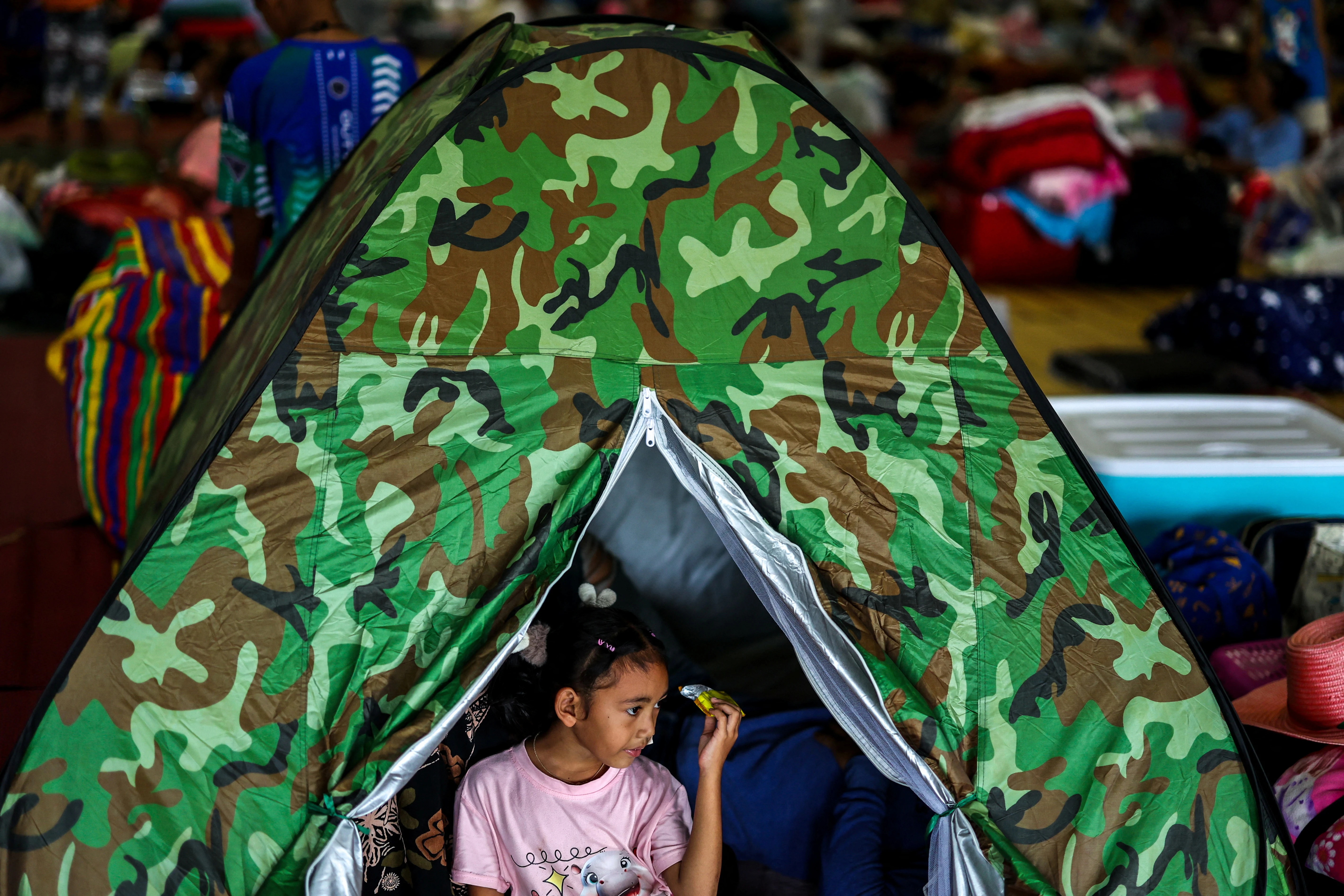 Bé gái 6 tuổi sống ở nơi trú ẩn tại Surin , Thái Lan khi căng thẳng biên giới nổ ra vào ngày 25/7 (Ảnh: Reuters).
