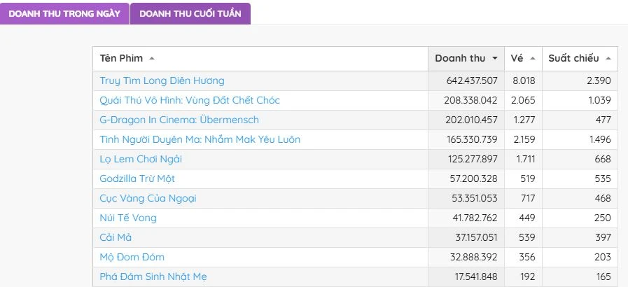 Trong đó, ngôi vương thuộc về Quái thú vô hình: Vùng đất chết chóc với 4.111 vé bán ra trên tổng số 977 suất chiếu, bỏ túi hơn 475 triệu đồng, theo Box Office Vietnam. Đây cũng là dự án có tỷ lệ lấp đầy rạp cao nhất.