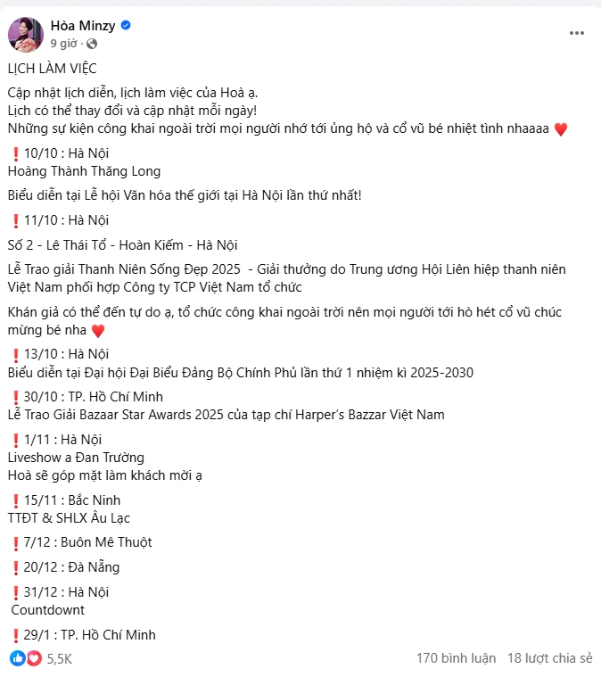 Và khi âm nhạc đã “phủ sóng” khắp nơi, Hòa Minzy cũng trở thành cái tên được săn đón nhất trong loạt sân khấu lớn, từ đại nhạc hội, chương trình chính luận, đến các sự kiện cộng đồng. Mới đây, Hòa Minzy cập nhật lịch làm việc tháng 10 khiến dân tình choáng ngợp. Ngày 10/10, Hòa Minzy có mặt tại Hoàng Thành Thăng Long để biểu diễn trong Lễ hội Văn hóa thế giới tại Hà Nội lần thứ nhất, hôm sau lại xuất hiện ở Hồ Gươm cho Lễ trao giải Thanh Niên Sống Đẹp 2025 do Trung ương Hội Liên hiệp Thanh niên Việt Nam tổ chức.