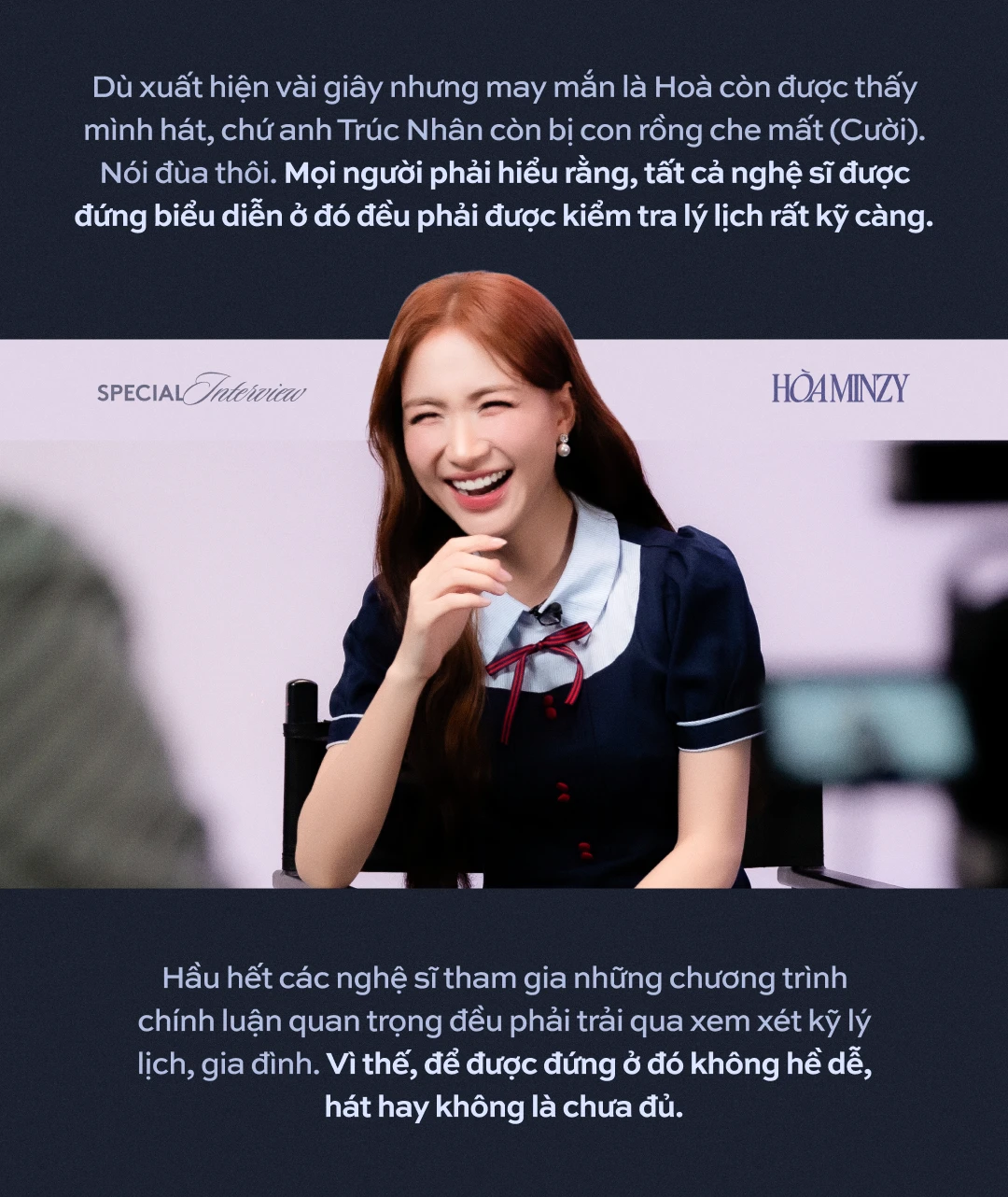 Dù xuất hiện vài giây nhưng may mắn là Hoà còn được thấy mình hát, chứ anh Trúc Nhân còn bị con rồng che mất (Cười). Nói đùa thôi. Mọi người phải hiểu rằng, tất cả nghệ sĩ được đứng biểu diễn ở đó đều phải được kiểm tra lý lịch rất kỹ càng. Hầu hết các nghệ sĩ tham gia những chương trình chính luận quan trọng đều phải trải qua xem xét kỹ lý lịch, gia đình. Vì thế, để được đứng ở đó không hề dễ, hát hay không là chưa đủ. Nghệ sĩ phải có hình ảnh tốt, lý lịch tốt, và có giá trị tốt với cộng đồng. Cho nên, một hay hai câu hát thực sự không quan trọng, kể cả Hoà đứng đó hát bè cũng đã là một vinh dự rồi.