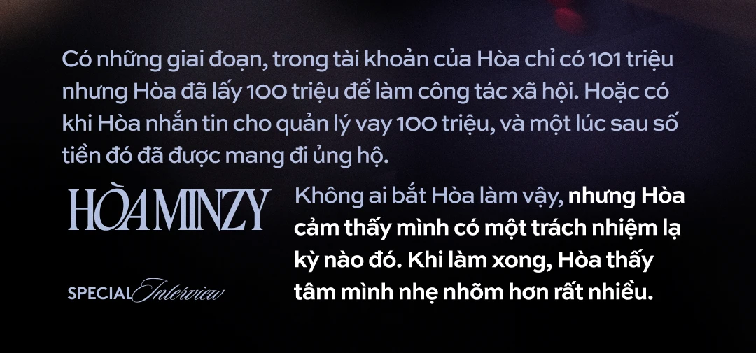 Từ lâu rồi, dù không ai bắt buộc nhưng Hòa luôn cảm thấy mình có trách nhiệm với cộng đồng. Gần đây, fan có gửi cho Hòa một bức ảnh tổng hợp các dự án thiện nguyện mà Hòa đã thực hiện trong 5 năm qua. Nhìn lại mình cũng thấy khá tự hào đấy chứ. Có những giai đoạn, trong tài khoản của Hòa chỉ có 101 triệu nhưng Hòa đã lấy 100 triệu để làm công tác xã hội. Hoặc có khi Hòa nhắn tin cho quản lý vay 100 triệu, và một lúc sau số tiền đó đã được mang đi ủng hộ. Không ai bắt Hòa làm vậy, nhưng Hòa cảm thấy mình có một trách nhiệm lạ kỳ nào đó. Khi làm xong, Hòa thấy tâm mình nhẹ nhõm hơn rất nhiều.
