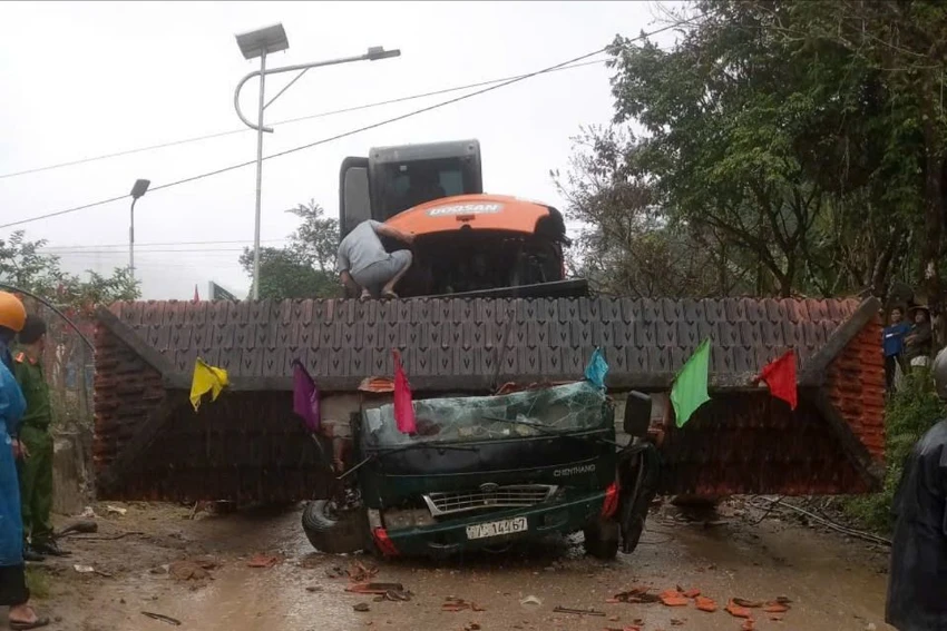 Xe tải chở theo xe múc phía trên va vào cổng chào của thôn Đắk Ốc (xã La Êê, TP Đà Nẵng) gây sập, đè lên cabin khiến tài xế và người đi cùng tử vong.