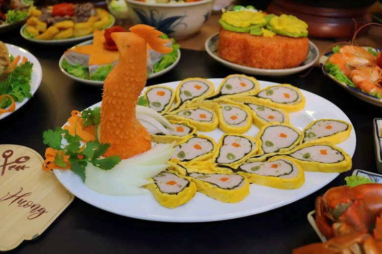 Bên cạnh “ngôi sao” xôi cá chép, mâm cỗ năm nay cũng chứng kiến sự lên ngôi của các loại bánh trái đẹp như tranh vẽ. Bánh bao đào tiên, bánh trôi nước tạo hình đài sen, hay những đĩa giò lụa được cắt tỉa thành hình hoa hồng tỉ mỉ. Các chị em không chỉ nấu ăn ngon mà còn như những nghệ nhân thực thụ.