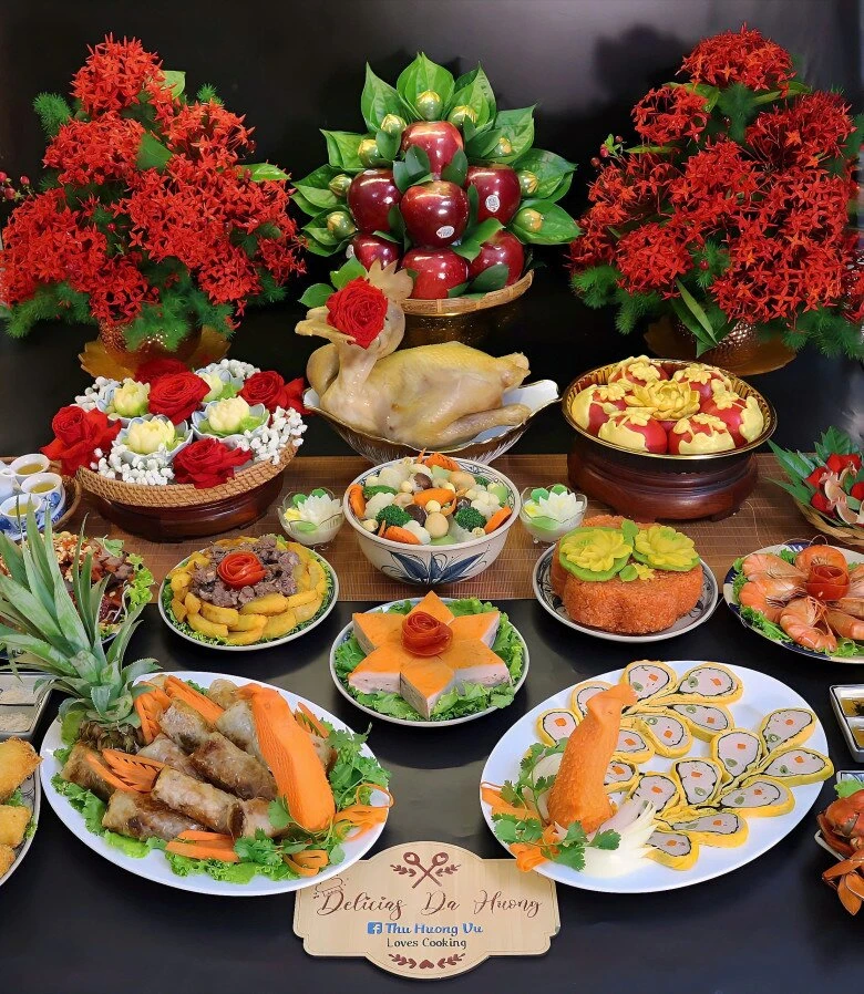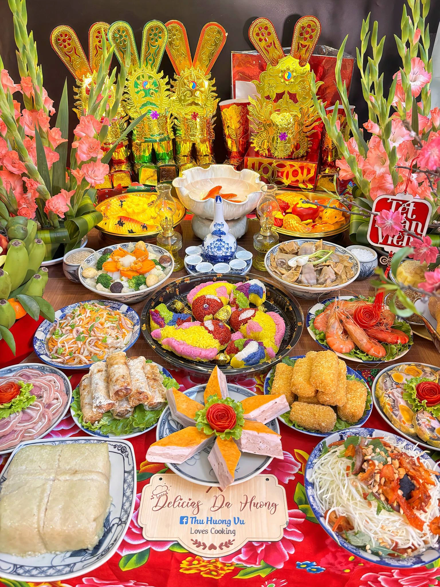 Mâm cúng ông Công ông Táo rực rỡ sắc màu của chị Vũ Thu Hương gồm gà luộc cánh tiên, tôm hấp nước dừa, nem rán tôm thịt truyền thống, nem hải sản chiên xù, chả quế Ước Lễ, chả hoa ngũ sắc, nộm đu đủ bò khô, mực khô xào su hào, tai heo cuộn lưỡi phay tiêu, canh măng khô nấu sườn móng, canh bóng thả, bánh chưng xanh, dưa hành, xôi Long ngư ngũ sắc.
