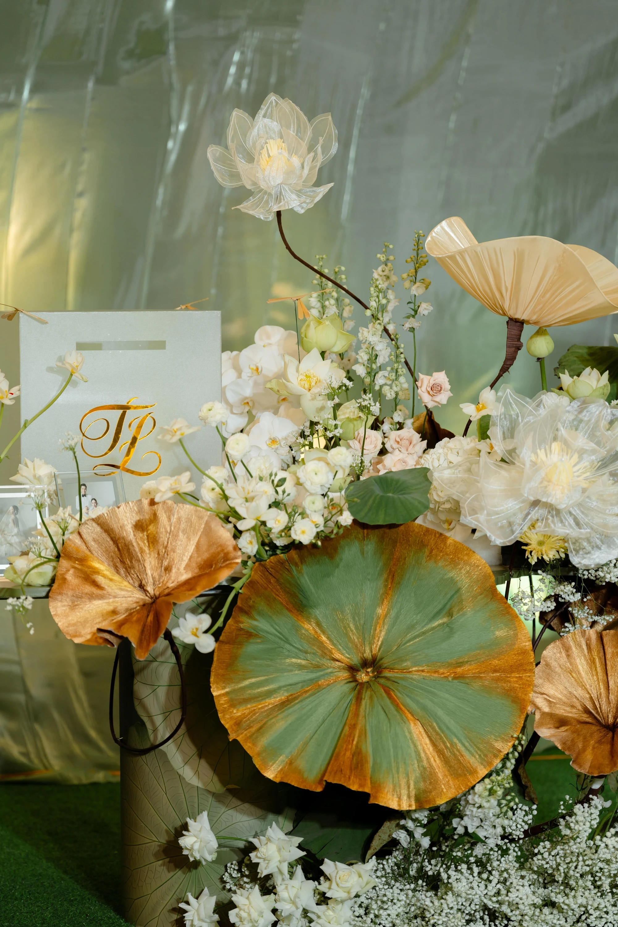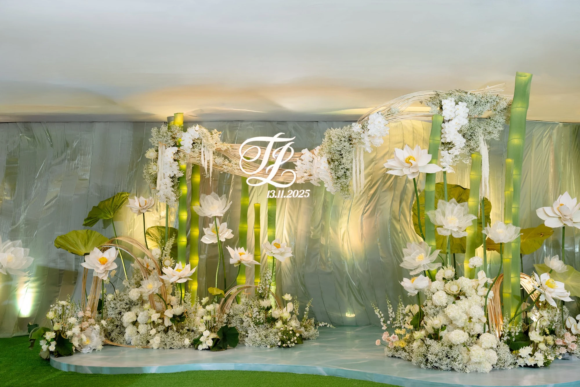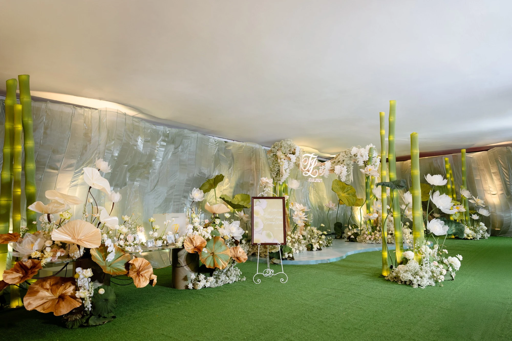 Cận không gian cưới kết hợp hoa tươi và tre của Hương Liên và Minh Trung