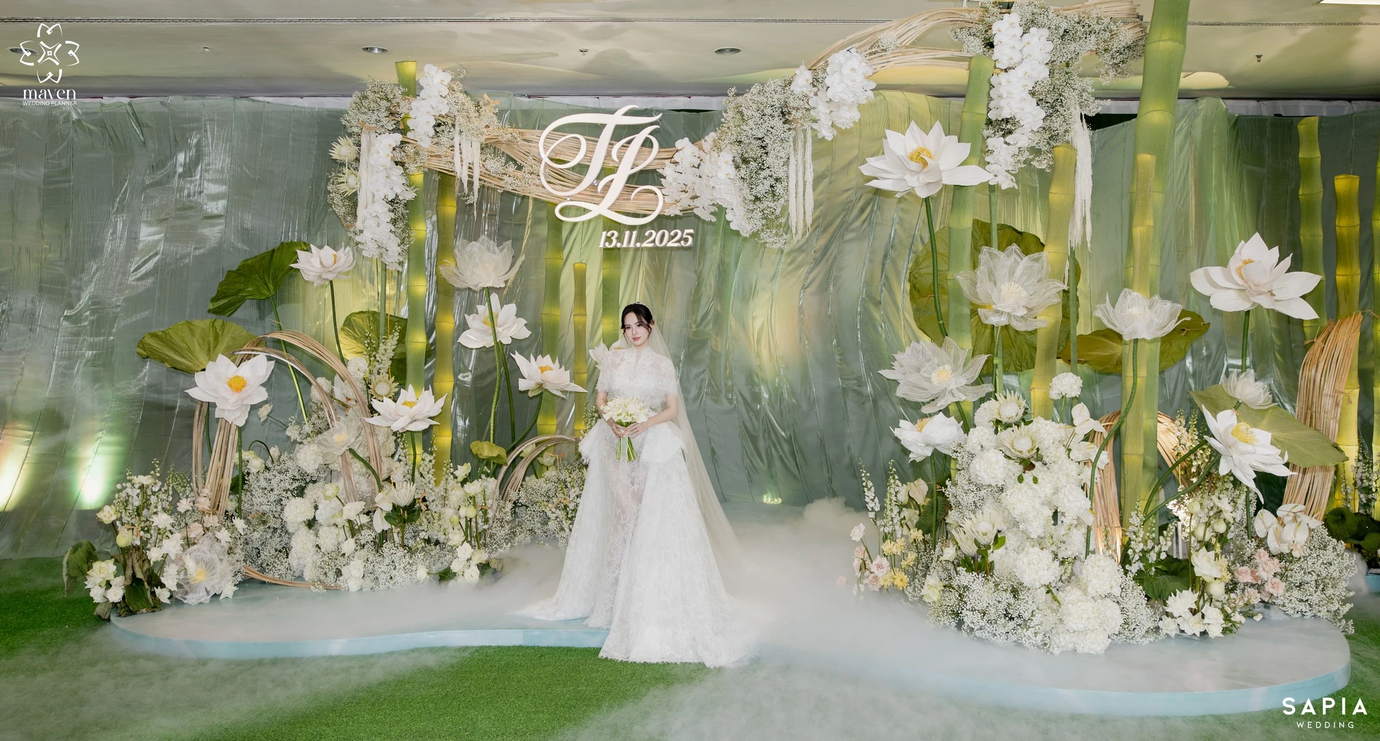 Chiều 13/11, đám cưới của người đẹp Hương Liên và chú rể Minh Trung diễn ra tại Hà Nội. Đây cũng là một trong những hôn lễ được mong chờ trong tháng 11 này. Không gian đám cưới của Hương Liên có màu xanh và trắng chủ đạo, hoạ tiết trang trí lấy cảm hứng từ hoa sen – giống tên Hương Liên của cô dâu và cây tre tượng trưng cho sự mạnh mẽ, rắn rỏi của chú rể. Từ sảnh đón khách đến lễ đường của cặp đôi ngập hoa tươi và những bức ảnh cưới tình tứ. Tất cả tạo nên không gian kết hợp hiện đại, truyền thống, tạo cảm giá xa hoa nhưng ấm cúng, nhẹ nhàng.