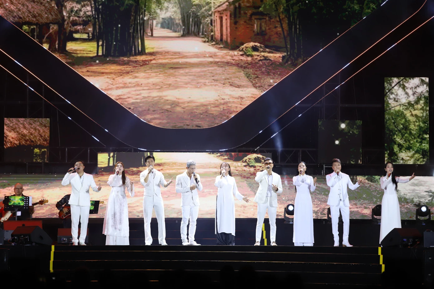 Ca sĩ Đàm Vĩnh Hưng cùng tốp ca trình bày bài hát Quê hương mở màn đêm nhạc thiện nguyện.