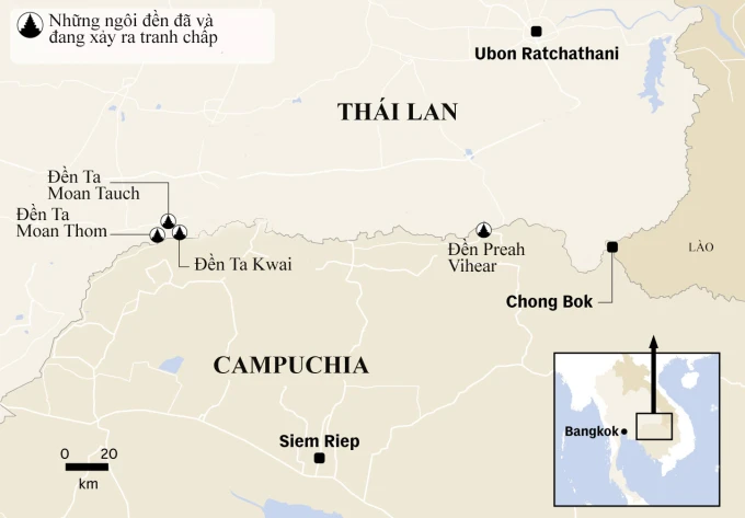 Vị trí đền Ta Muan Thom cùng các đền tranh chấp giữa Campuchia và Thái Lan. Đồ họa: CNA