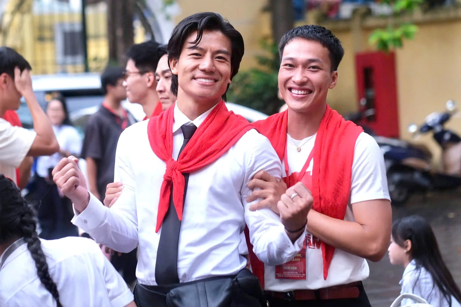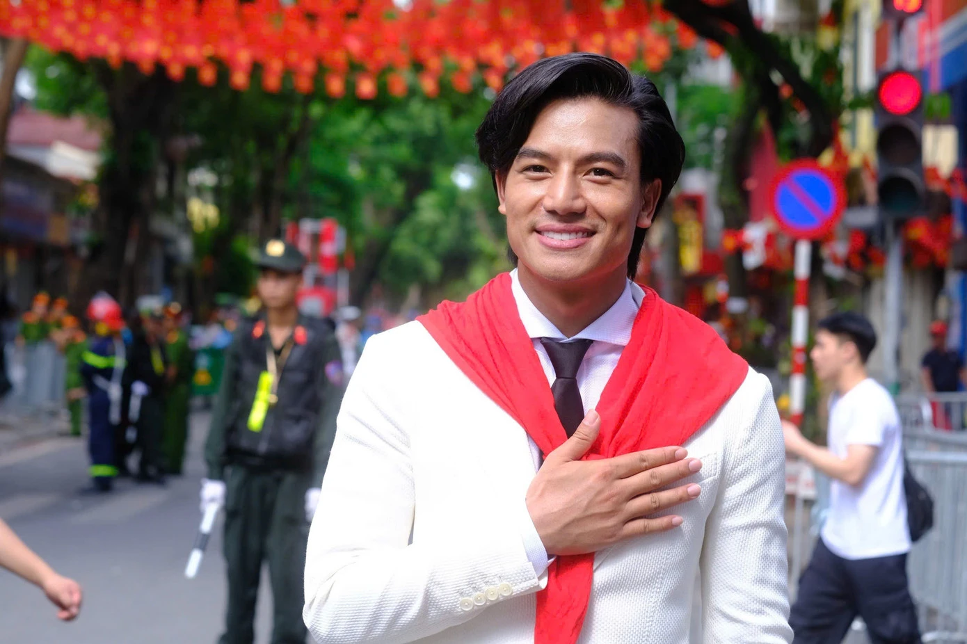Hiếu Nguyễn bày tỏ niềm vinh dự khi cùng dàn diễn viên phim Mưa đỏ góp mặt trong đội hình diễu hành của khối văn hóa - thể thao. Trong buổi tổng duyệt, nam diễn viên diện trang phục lịch lãm, hào hứng khi có dịp hội ngộ nhiều đồng nghiệp. Anh cho biết thời gian qua, bản thân giữ tinh thần nghiêm túc, tập trung cho việc luyện tập vì xem đây là trải nghiệm đặc biệt trong sự nghiệp.