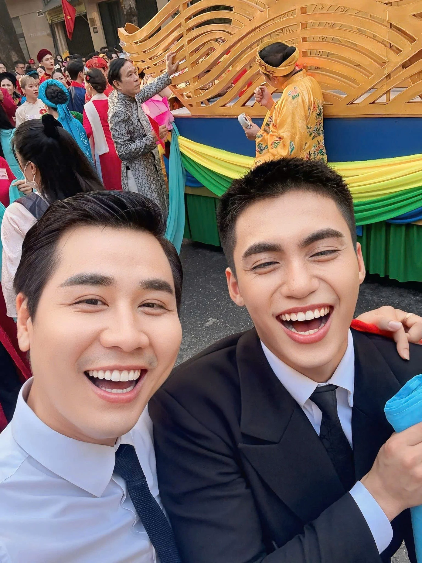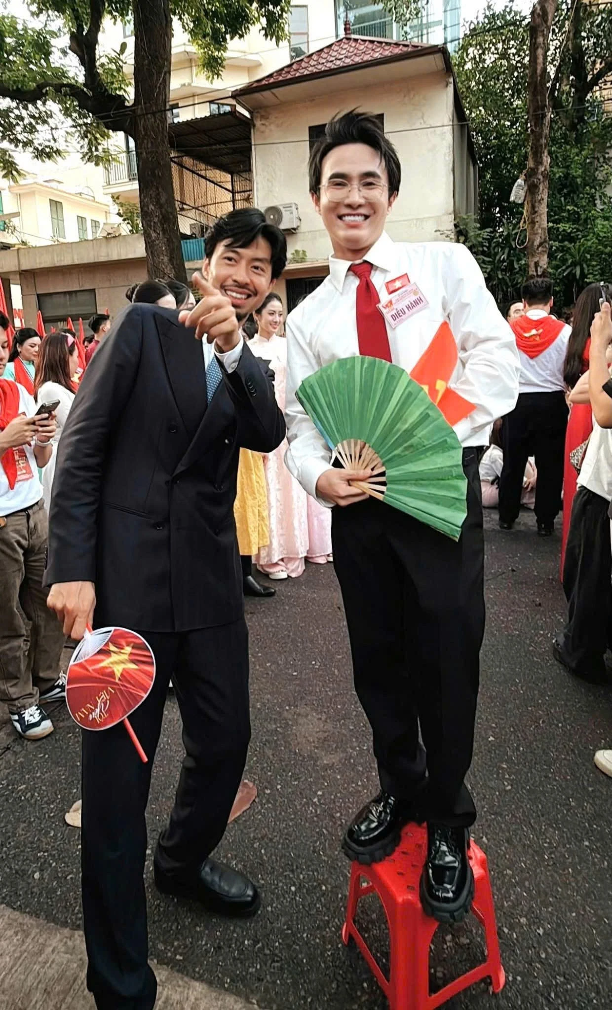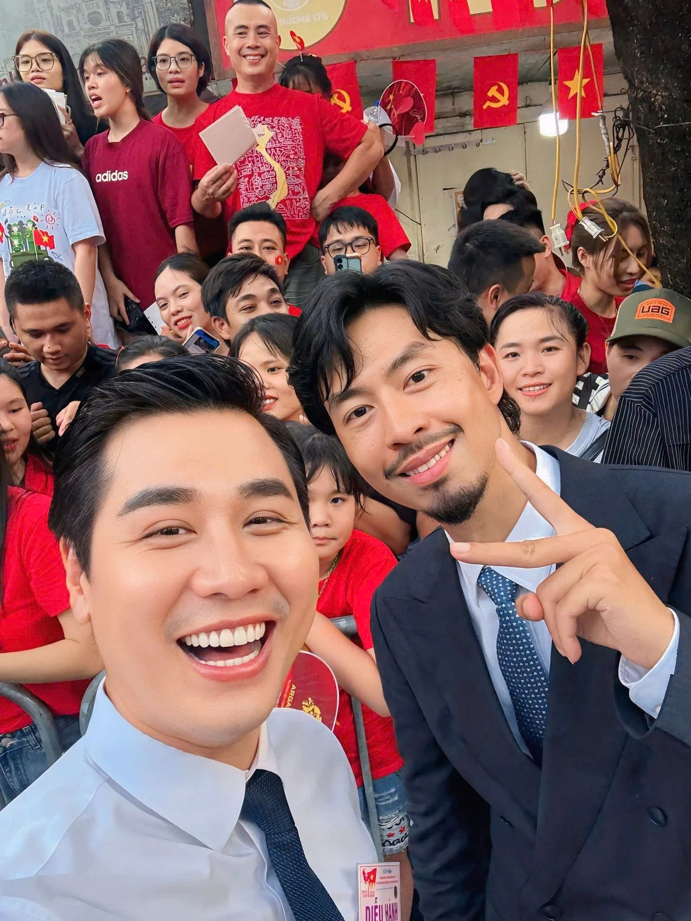 Nguyên Khang chụp ảnh cùng nguyên dàn nghệ sĩ trong lễ diễu hành sáng 2/9. ” Những kỷ niệm với A80 mà chúng tôi sẽ không bao giờ quên. Hạnh phúc, tự hào, ấm áp và thiêng liêng” , nam MC viết.