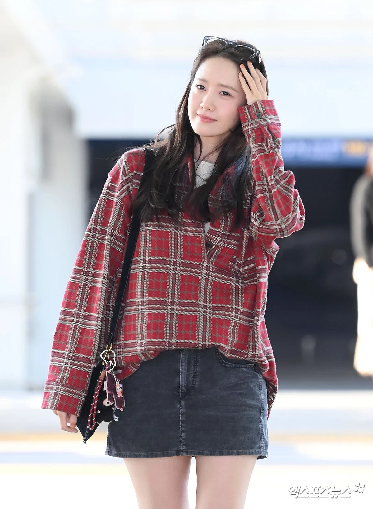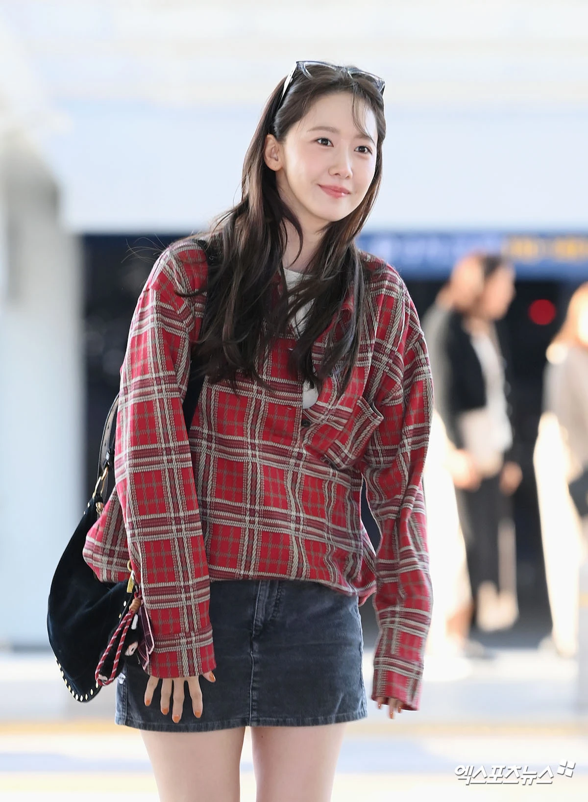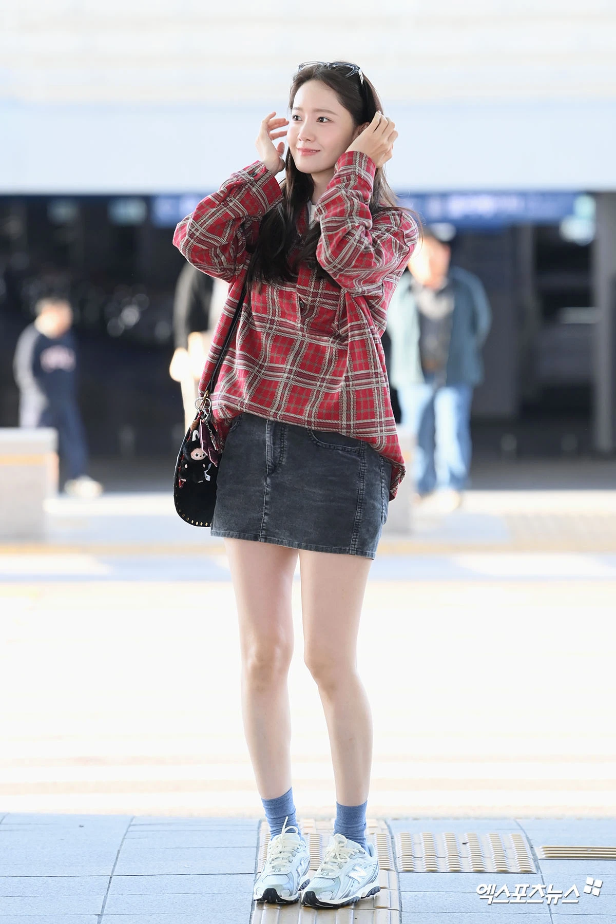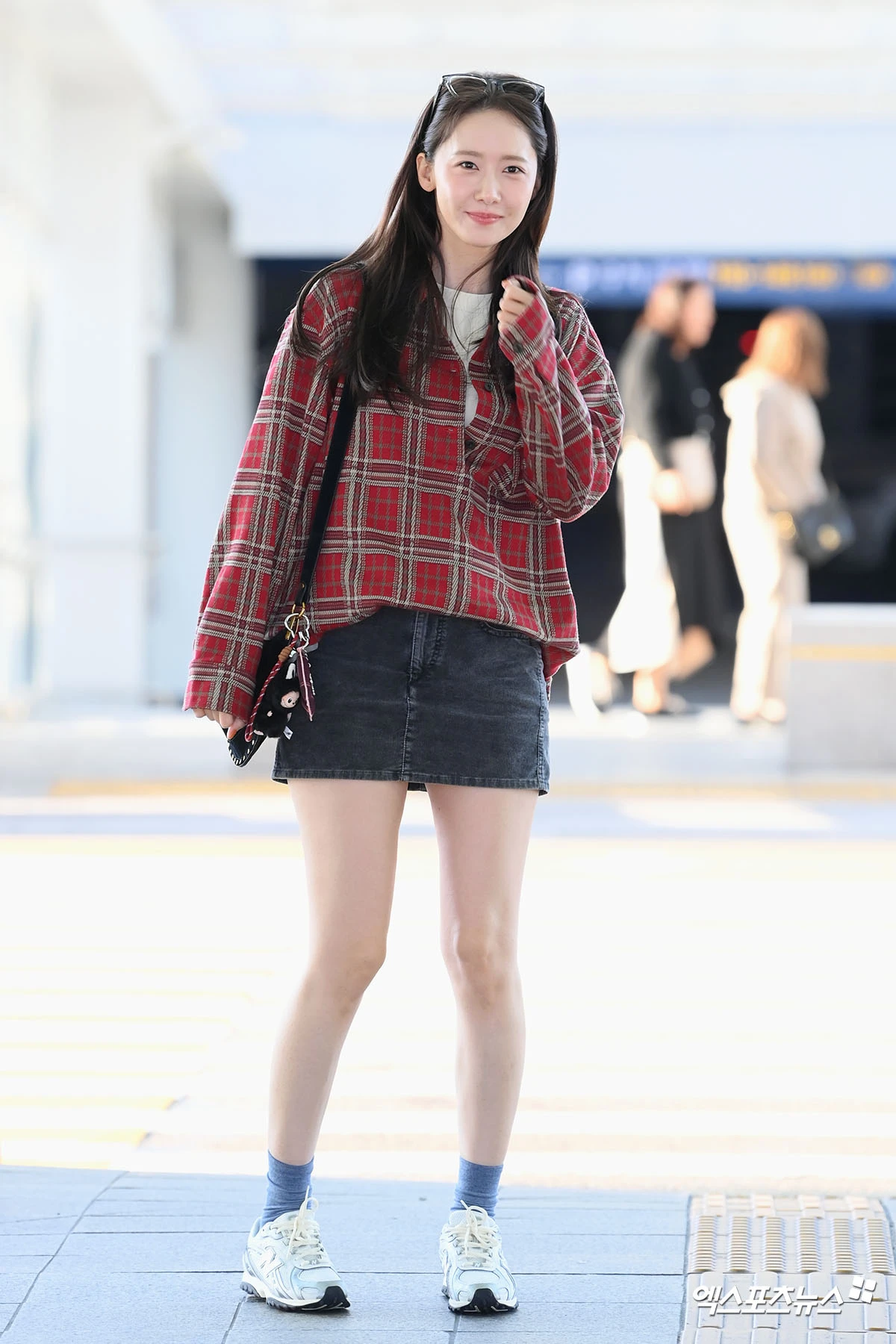 Yoona diện áo kẻ đỏ ấm áp cùng chân váy jeans ngắn, đi giày thể thao năng động