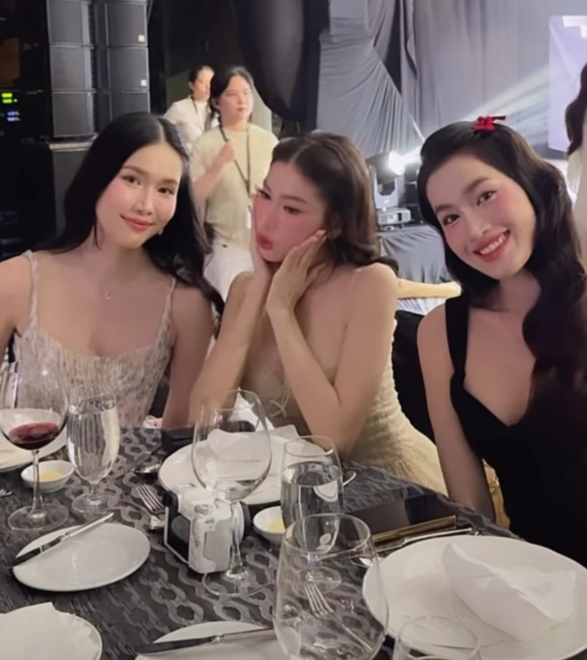 Trong khi đó, Hoa hậu Lương Thùy Linh xuất hiện trong váy màu nude trơn sang trọng, mái tóc búi cao tôn lên gương mặt thanh thoát. Còn Á hậu Hoàng Thùy chọn “cây đồ” ánh vàng được lấp lánh, gồm áo khoác dáng ngắn phối cùng chân váy, bên trong là crop top tiệp màu giúp Hoàng Thùy khéo léo khoe vòng eo săn chắc và vóc dáng chuẩn mẫu.