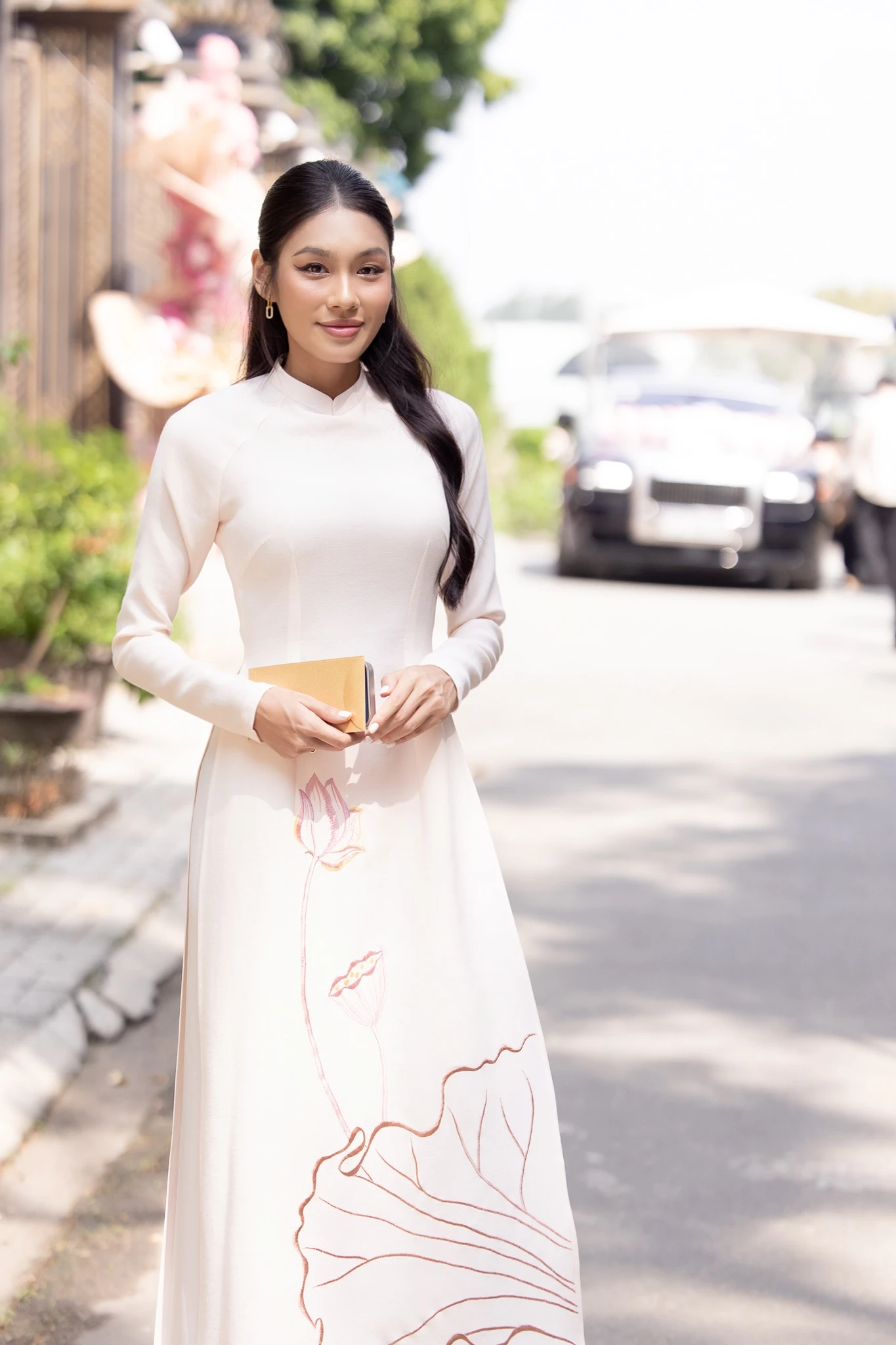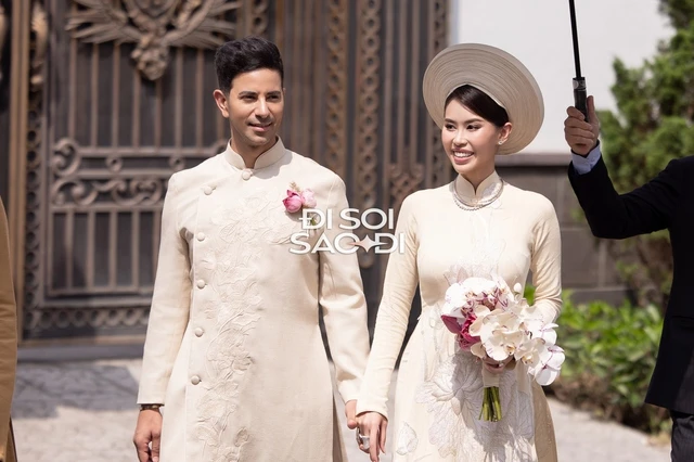 Tiên Nguyễn lựa chọn áo dài màu kem nền nã, họa tiết thêu tinh xảo cùng mấn đồng điệu, tạo tổng thể thanh lịch nhưng vẫn toát khí chất sang trọng đặc trưng. Gương mặt được trang điểm nhẹ nhàng càng làm lộ rõ đường nét hài hòa, đúng chuẩn hình ảnh nàng dâu trâm anh thế phiệt. Bên cạnh đó, chú rể Justin Cohen cũng diện áo dài truyền thống tông màu đồng điệu với vợ, visual tân lang tân nương xứng đôi vừa lứa.
