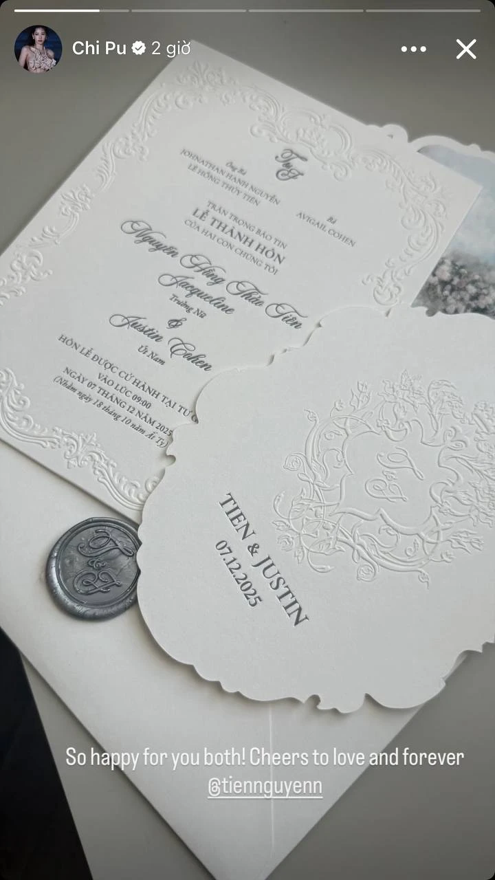 Chi Pu chia sẻ hình ảnh thiệp cưới của Tiên Nguyễn trên mạng xã hội