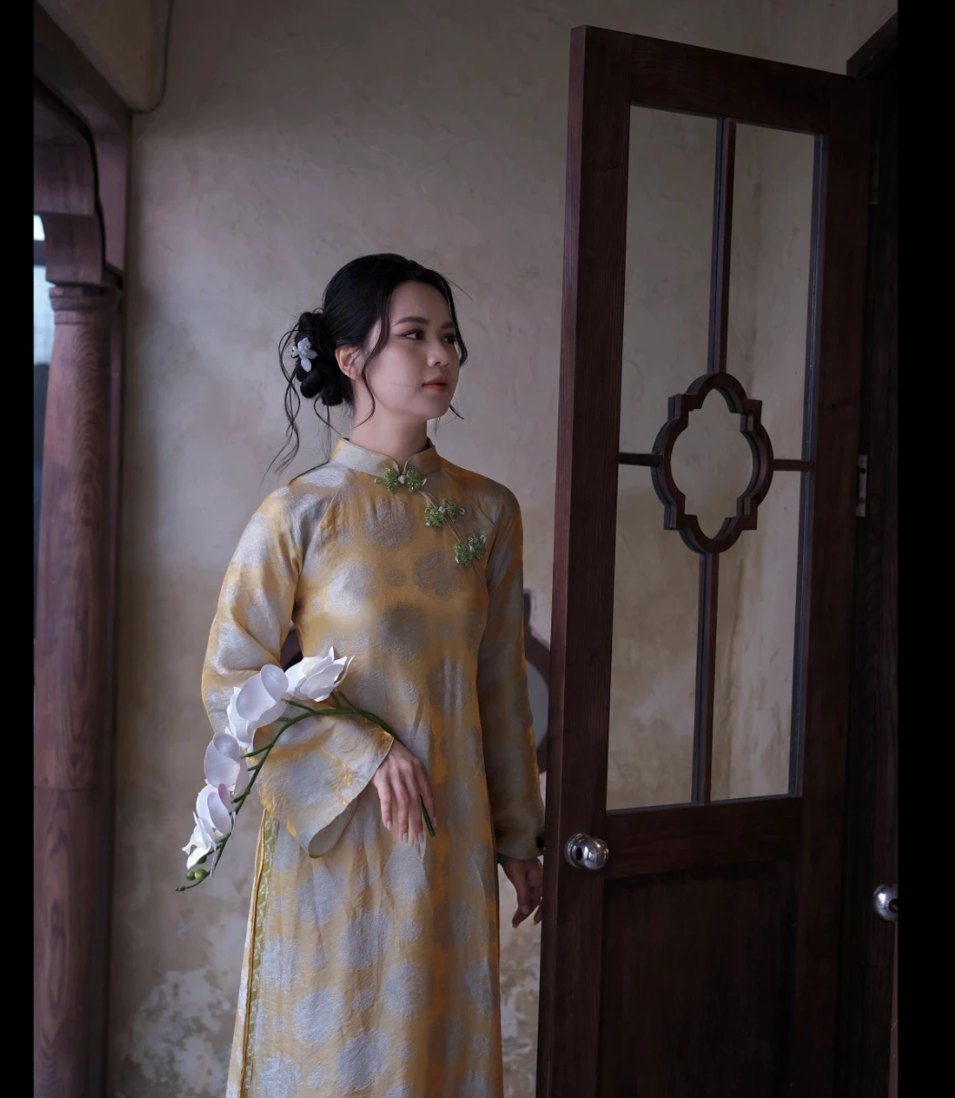 Trong loạt ảnh đu trend áo dài Tết, bà xã Quế Ngọc Hải chọn thiết kế mang tông vàng – be nhã nhặn, họa tiết tinh tế, form dáng cổ điển tôn trọn vẻ đẹp Á Đông. Kiểu tóc búi thấp điểm xuyết hoa, layout trang điểm trong veo càng làm bật lên nét ngọt ngào, phúc hậu – đúng kiểu “vẻ đẹp của người phụ nữ đã yên bề gia thất” nhưng vẫn rất cuốn.