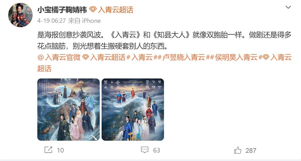Mới đây, bộ phim ngắn của Việt Nam Tri Huyện Đại Nhân trở thành tiêu điểm chú ý của khán giả Trung Quốc, khi poster phim khá giống với tác phẩm cổ trang Nhập Thanh Vân do Hầu Minh Hạo và Lư Dục Hiểu đóng chính.