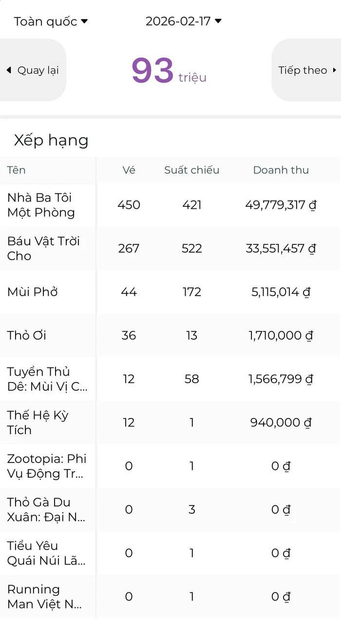 Tín hiệu khởi động sớm của mùa phim Tết 2026 phần nào cho thấy điều đó. Theo số liệu từ Box Office Vietnam, trong ngày mở bán vé sớm, Nhà Ba Tôi Một Phòng của Trường Giang tạm dẫn đầu với hơn 50 triệu đồng doanh thu, trong khi Thỏ Ơi! của Trấn Thành mới chỉ ghi nhận hơn 1 triệu đồng. Dù đây chỉ là giai đoạn thăm dò và chưa phản ánh cục diện thực sự, con số này vẫn nhanh chóng trở thành đề tài bàn luận sôi nổi bởi nó đi ngược với hình ảnh “bất bại” mà khán giả từng quen thuộc khi nhắc đến Trấn Thành.