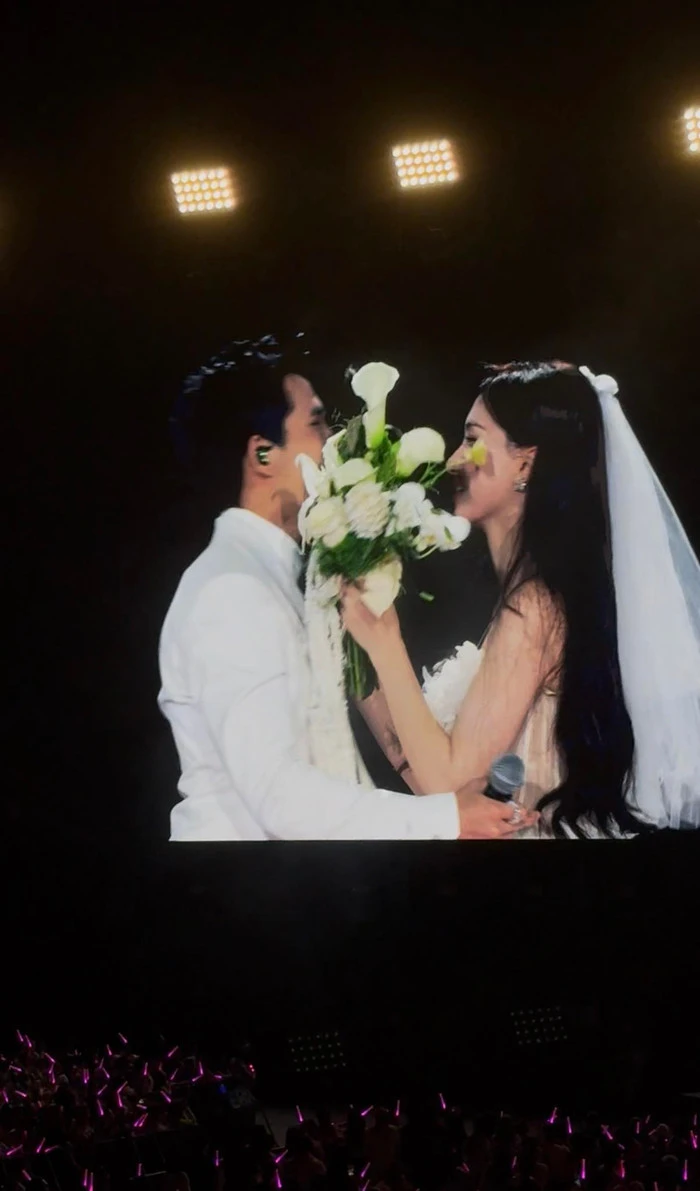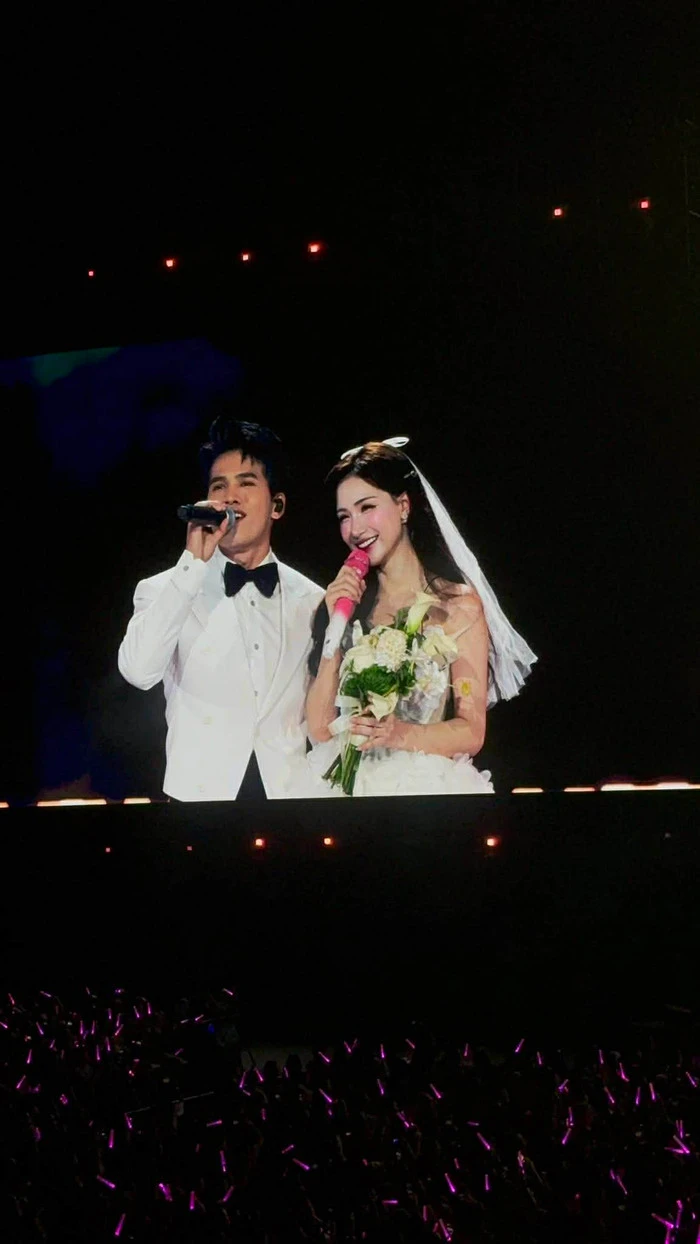 Trong đó, khoảnh khắc gây chú ý nhất chính là màn trình diễn đặc biệt khi Hòa Minzy xuất hiện trên sân khấu trong bộ váy cưới trắng tinh khôi, tay cầm bó hoa cô dâu và song ca cùng Quốc Thiên. Không gian sân khấu được bài trí lãng mạn, tạo cảm giác như một lễ cưới thực thụ, khiến nhiều khán giả không khỏi bất ngờ và thích thú.