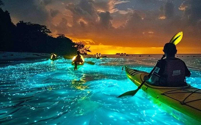 Đặc biệt ấn tượng là tour đi thuyền kayak ban đêm trong rừng ngập mặn trên đảo Havelock (thuộc quần đảo Andaman, Ấn Độ) – nơi mặt nước rực rỡ với hiện tượng phát quang sinh học. Ảnh: travel.india