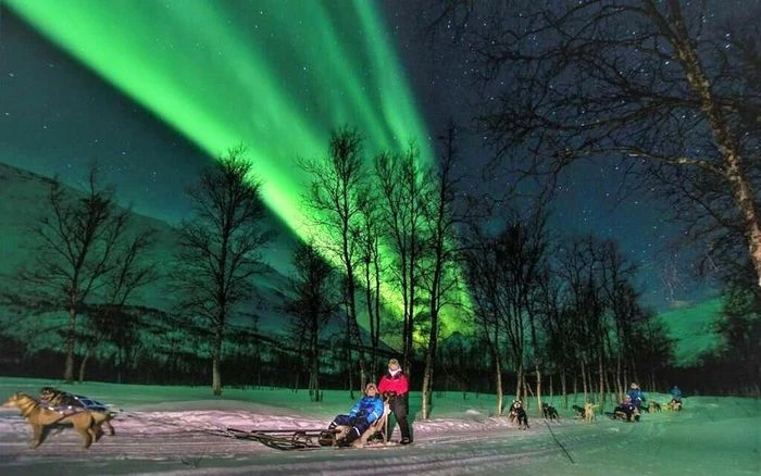 Tour trải nghiệm xe trượt tuyết do chó kéo dưới ánh cực quang phương Bắc tại quần đảo Svalbard, Na Uy. Ảnh: fjord travel norway