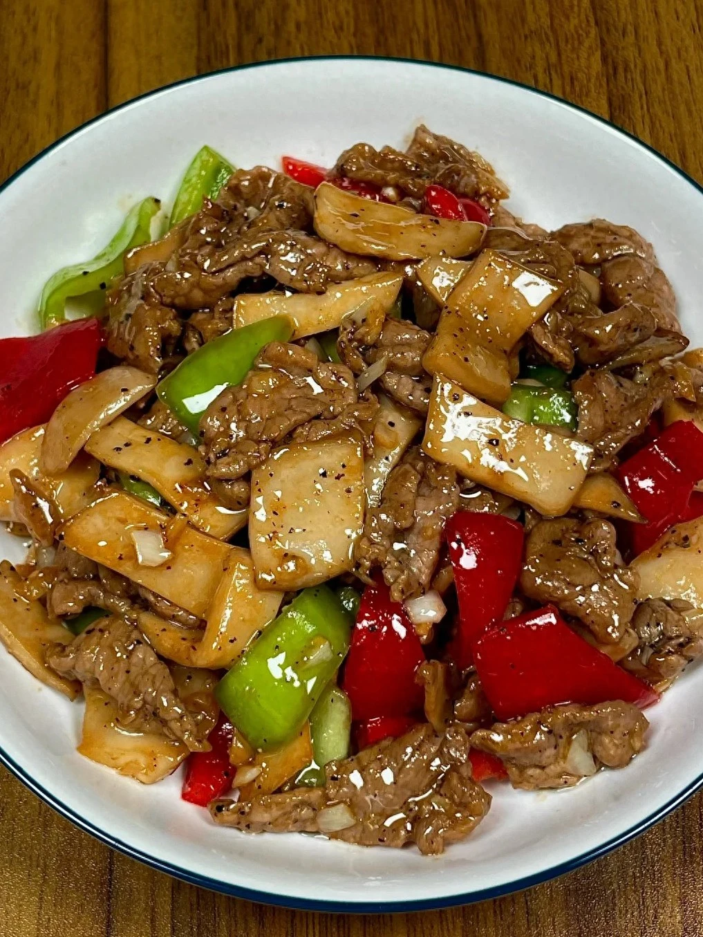 Cho thịt bò trở lại chảo, thêm 2 thìa canh nước sốt tiêu đen và 1 thìa canh dầu hào, xào nhanh trên lửa lớn. Cuối cùng,thêm ớt chuông xanh và đỏ vào, xào vài lần rồi tắt bếp!