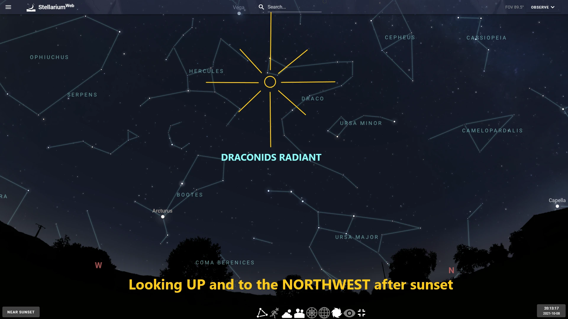 Bản đồ bầu trời với vị trí phát ra những ngôi sao băng Draconids được đánh dấu bằng vòng tròn vàng, gần phần đầu của hình ảnh con rồng do chòm sao Thiên Long tạo nên