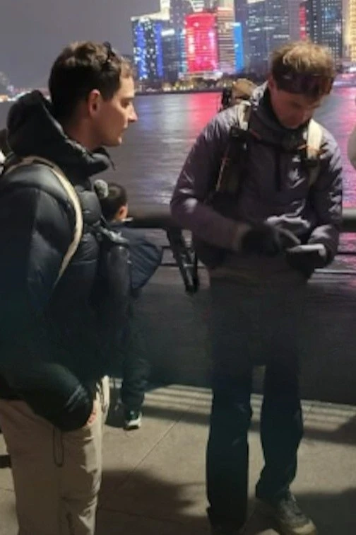 | Loic Voisot và Benjamin Humblot ôm chầm lấy nhau bên bờ sông trên bến Thượng Hải, đánh dấu kết thúc chuyến đi bộ phi thường từ Pháp đến Trung Quốc. Ảnh: HK01. |