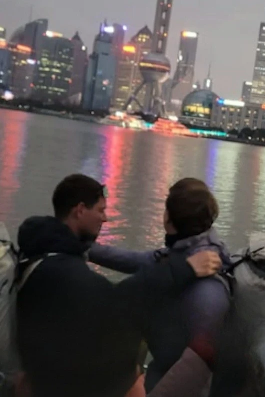 Cả hai ôm chầm lấy nhau bên bờ sông tại khu Bund (Bến Thượng Hải), trong khung cảnh đường chân trời rực sáng của trung tâm tài chính Trung Quốc.