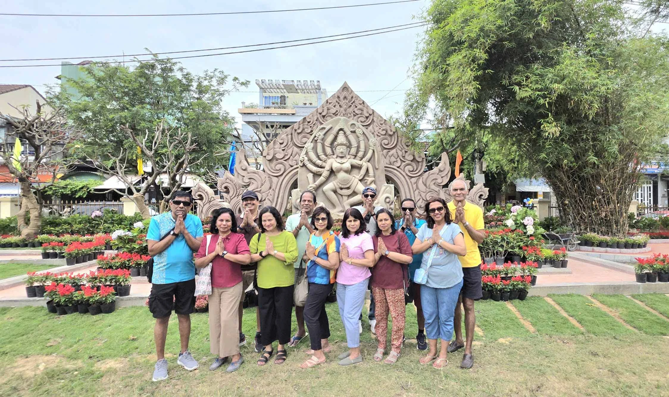 Tại di tích quốc gia Tháp Đôi, đoàn du khách Ấn Độ hào hứng chụp ảnh lưu niệm tại Phù điêu nữ thần Mahishasura Mardini