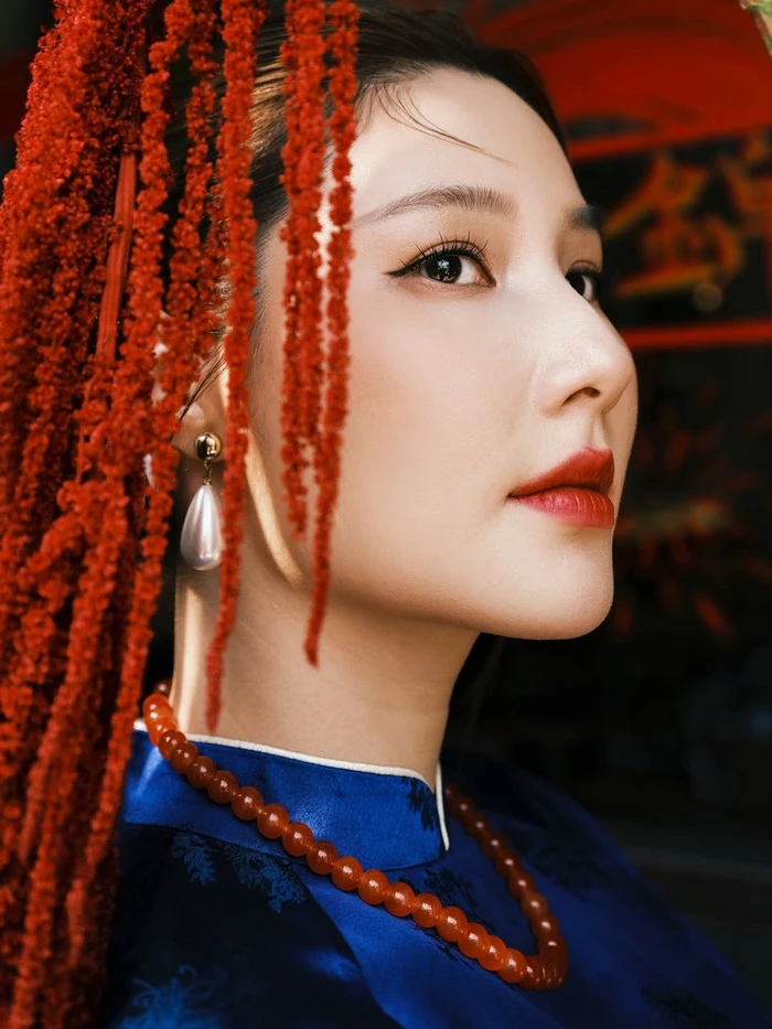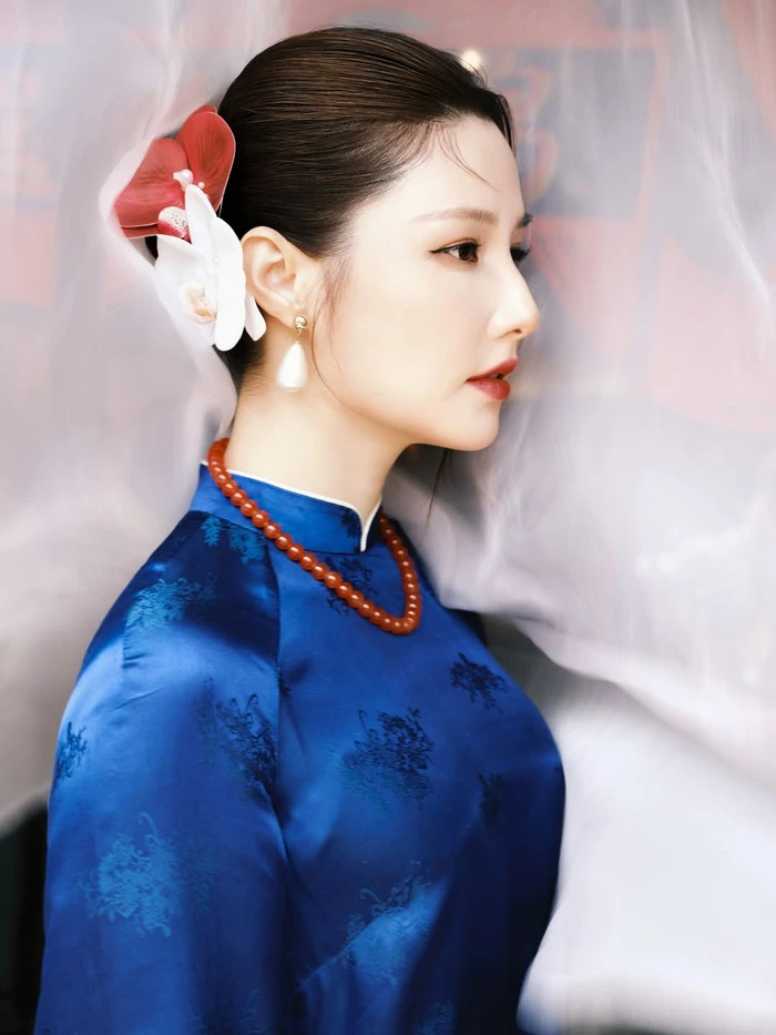 Điểm nhấn trong tạo hình còn đến từ phụ kiện ngọc trai và vòng hạt đỏ nâu, được Diễm My phối khéo léo, không quá cầu kỳ nhưng đủ tạo nét sang trọng. Kiểu tóc được búi gọn gàng, kết hợp cùng hoa cài tóc tông đỏ – trắng nổi bật, mang lại cảm giác vừa truyền thống vừa hiện đại.